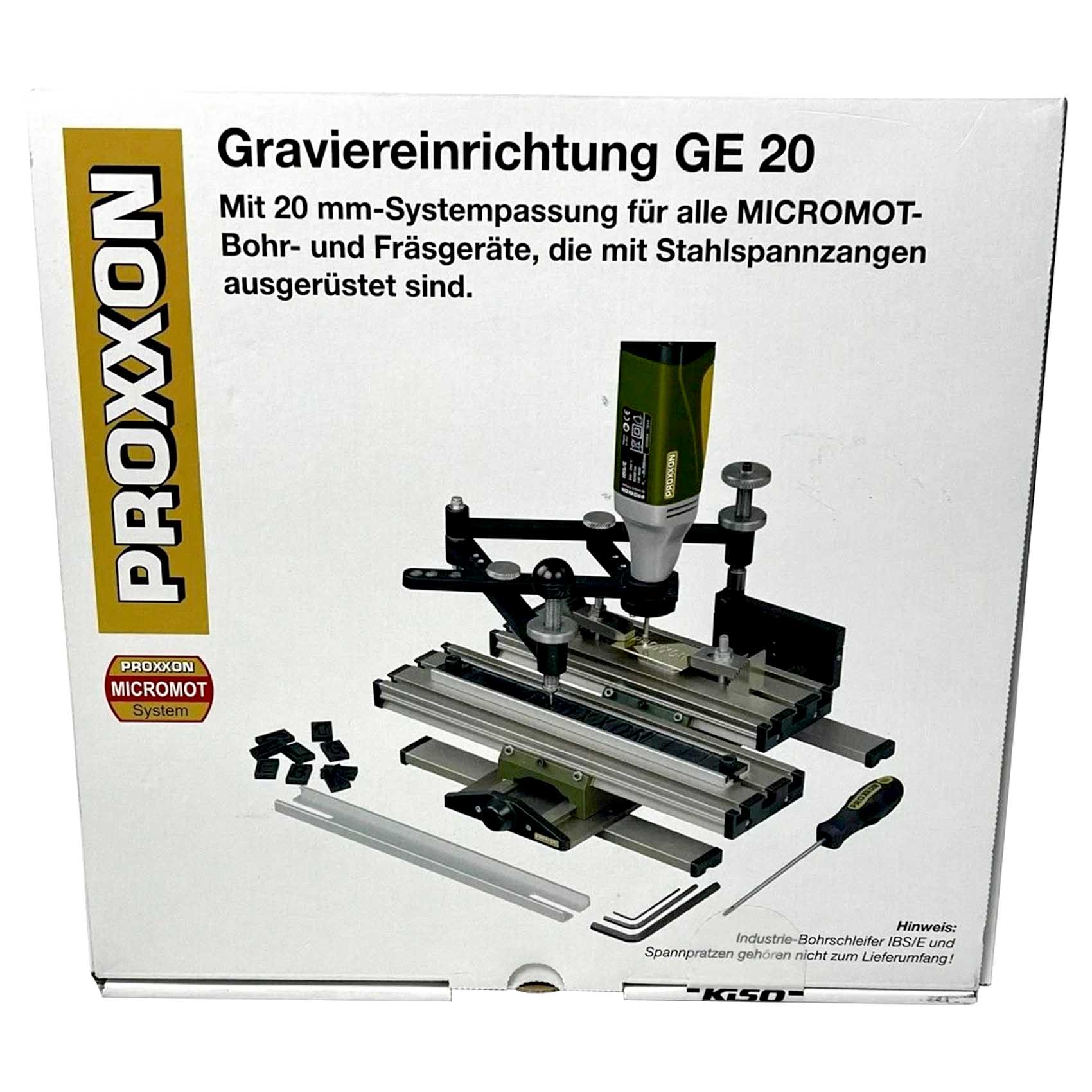 PROXXON ENGRAVING DEVICE GE20 27106 HOLDS A MAXIMUM OF 14 LETTERS | THE LETTERING TO BE MILLED IS SCALED DOWN DURING TRANSFER | TRANSFER RATIO CAN BE FIXED AT 2:1, 3:1, 4:1 OR 5:1 BY SIMPLY ADJUSTING TWO SCREWS | MADE IN GERMANY