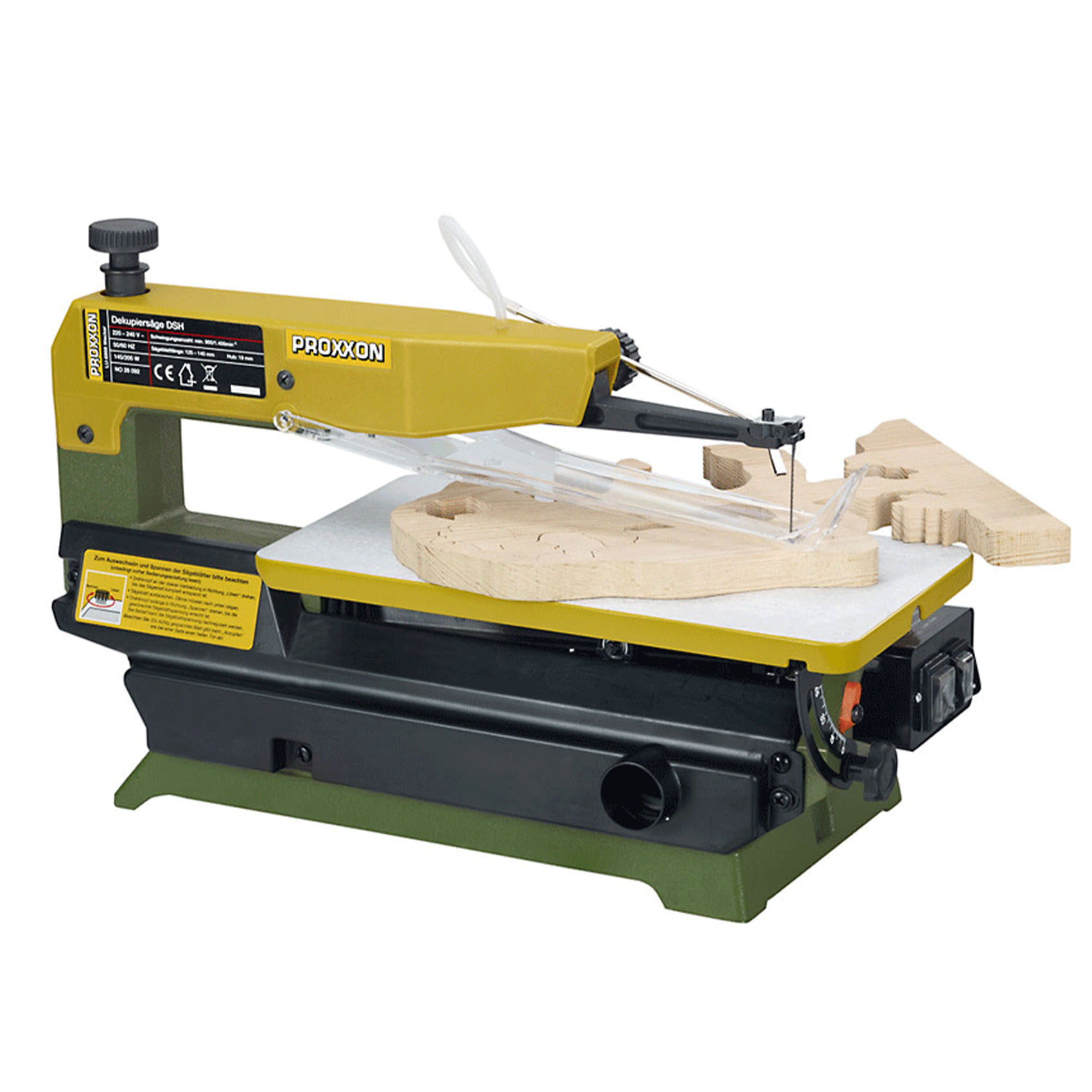 PROXXON 2 SPEED SCROLL SAW DSH 28092 STROKE LENGTH 19MM - THROAT 400MM | MAXIMUM CUTTING DEPTH 50MM, AT 45° MITRE 25MM | 900 OR 1,400 RPM | FOR STANDARD SAW BLADES WITH PIN ENDS. BUT NORMAL FRETSAW BLADES WITHOUT PINS ALSO CAN BE SECURELY CLAMPED | MADE IN GERMANY