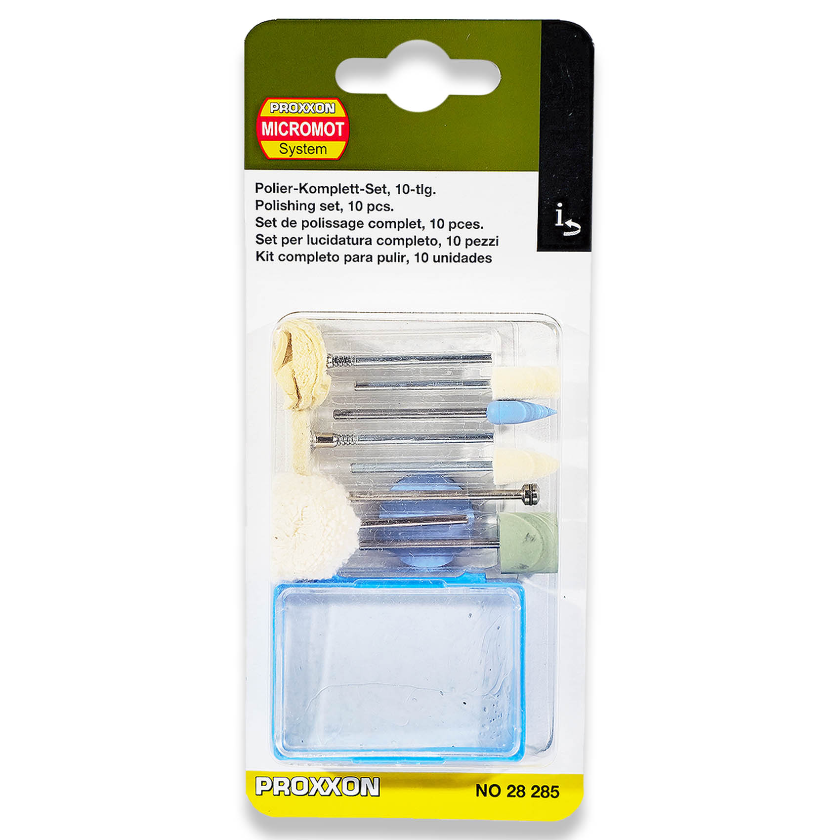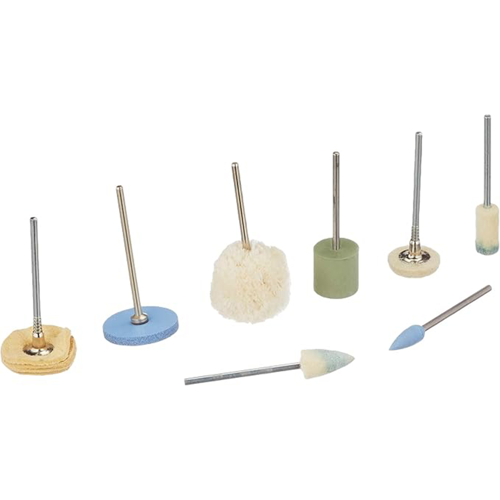 INCLUDES : CONSISTING OF 3 FELT POLISHING BITS (CYLINDER, CONE AND WHEEL SHAPES), 3 SILICON POLISHING BITS (BULLET, CYLINDER AND DISC SHAPE), COTTON POLISHING DISC, CHAMOIS BUFFING WHEEL AND POLISHING PASTE. INCLUDES 2.35 X 44MM ARBOR.
