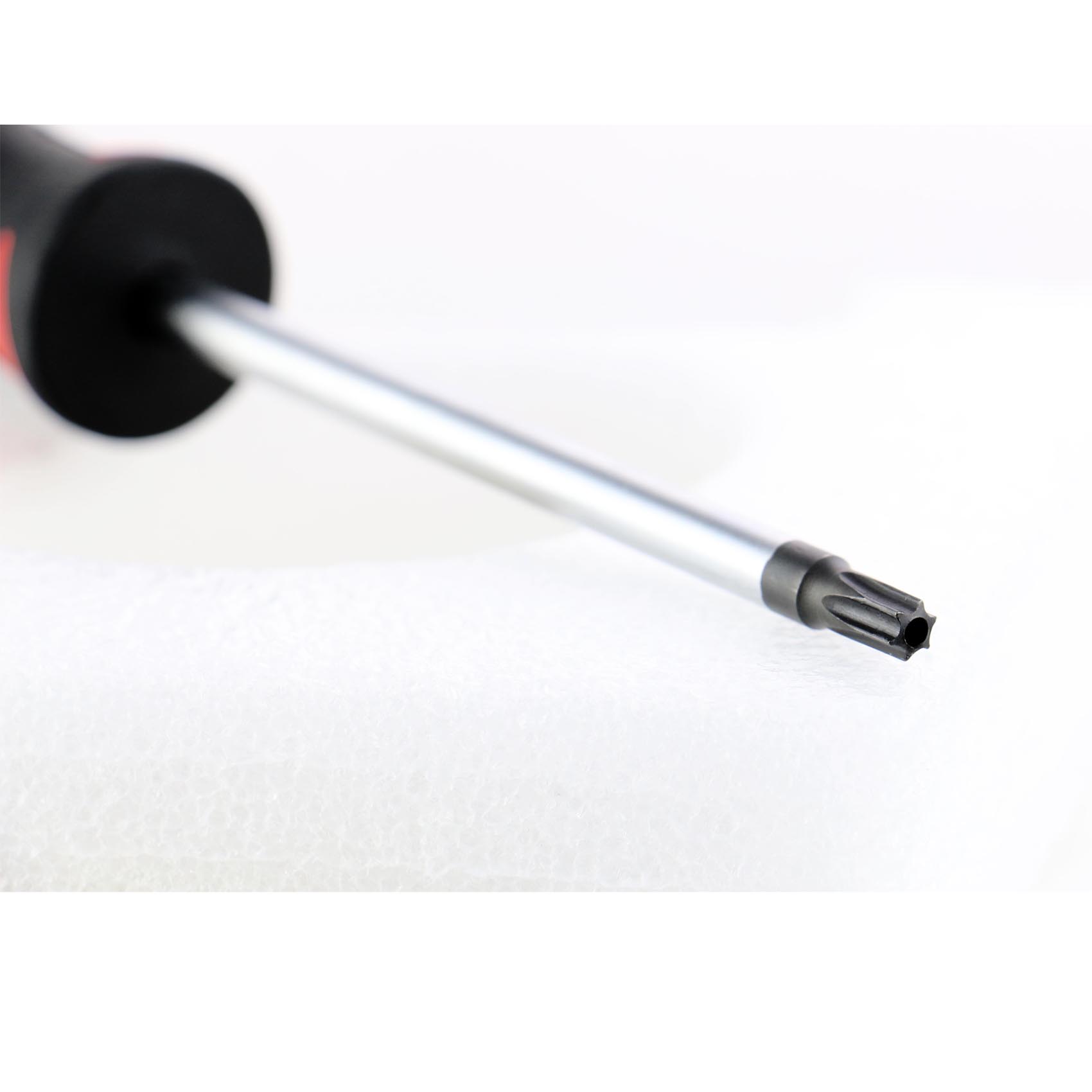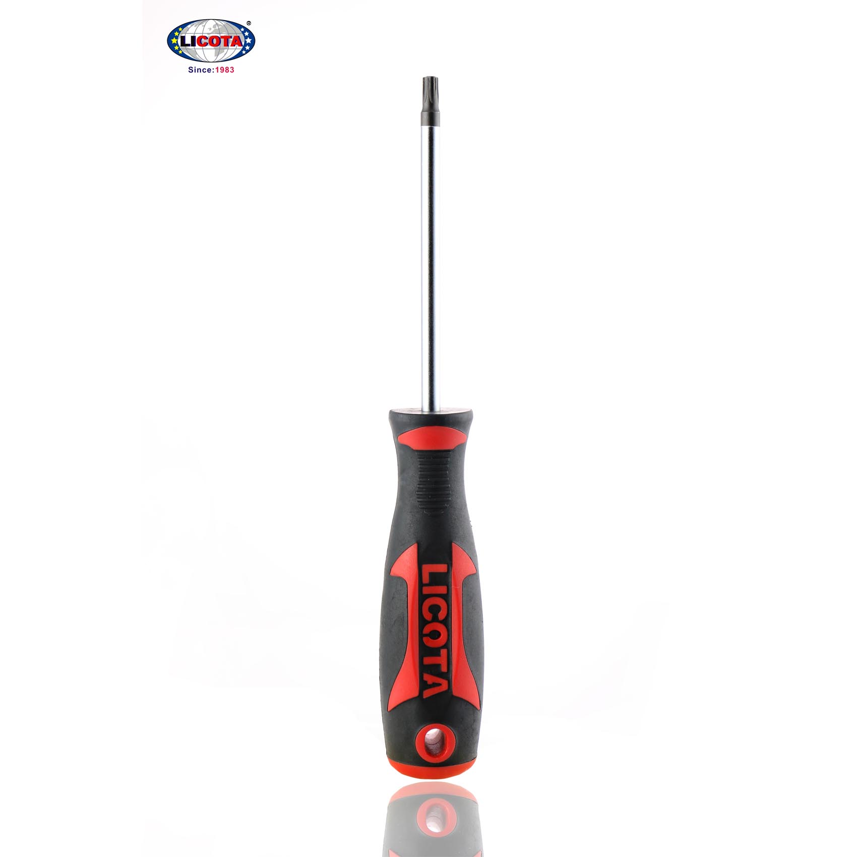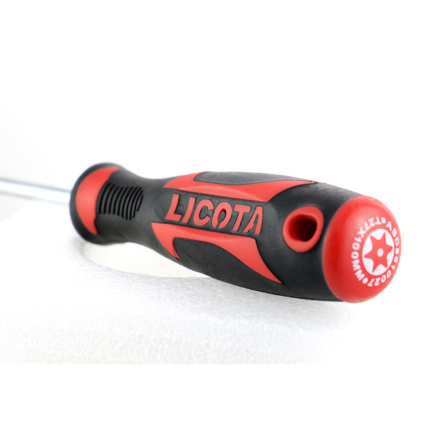 The LICOTA Torx Tamper Professional Screwdriver T27x100mm (ASD-5610027) is a high-quality tool made in Taiwan. It features a T27H size with a blade that is hardened to H.R.C. 58-62, satin finished, and includes a black magnetic tip. The screwdriver is made from durable S2 material and is designed with dimensions of 100mm in length, 114mm in total length, and a 6mm diameter. Weighing 150g, it meets DIN 50150 standards, ensuring reliability and precision for professional use.