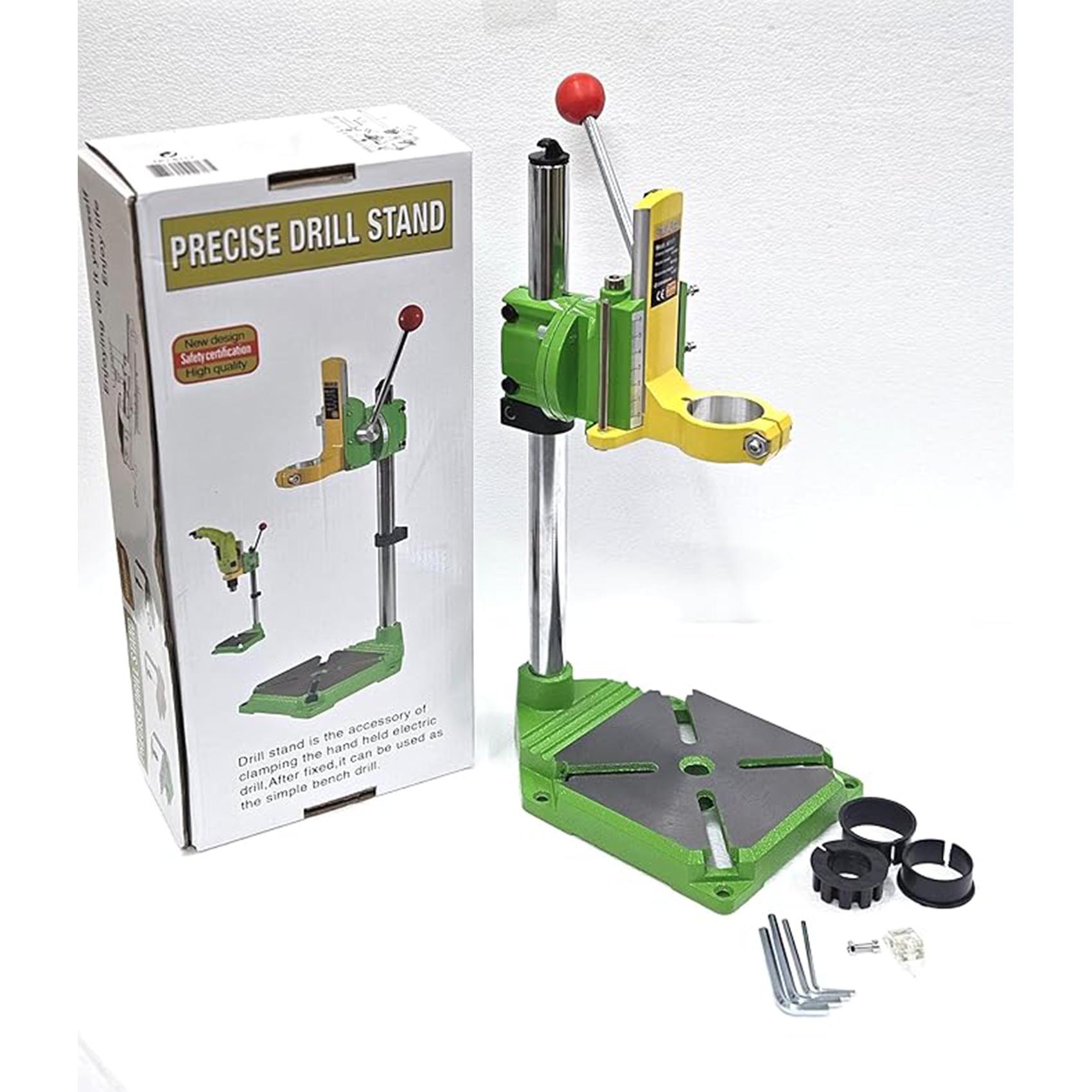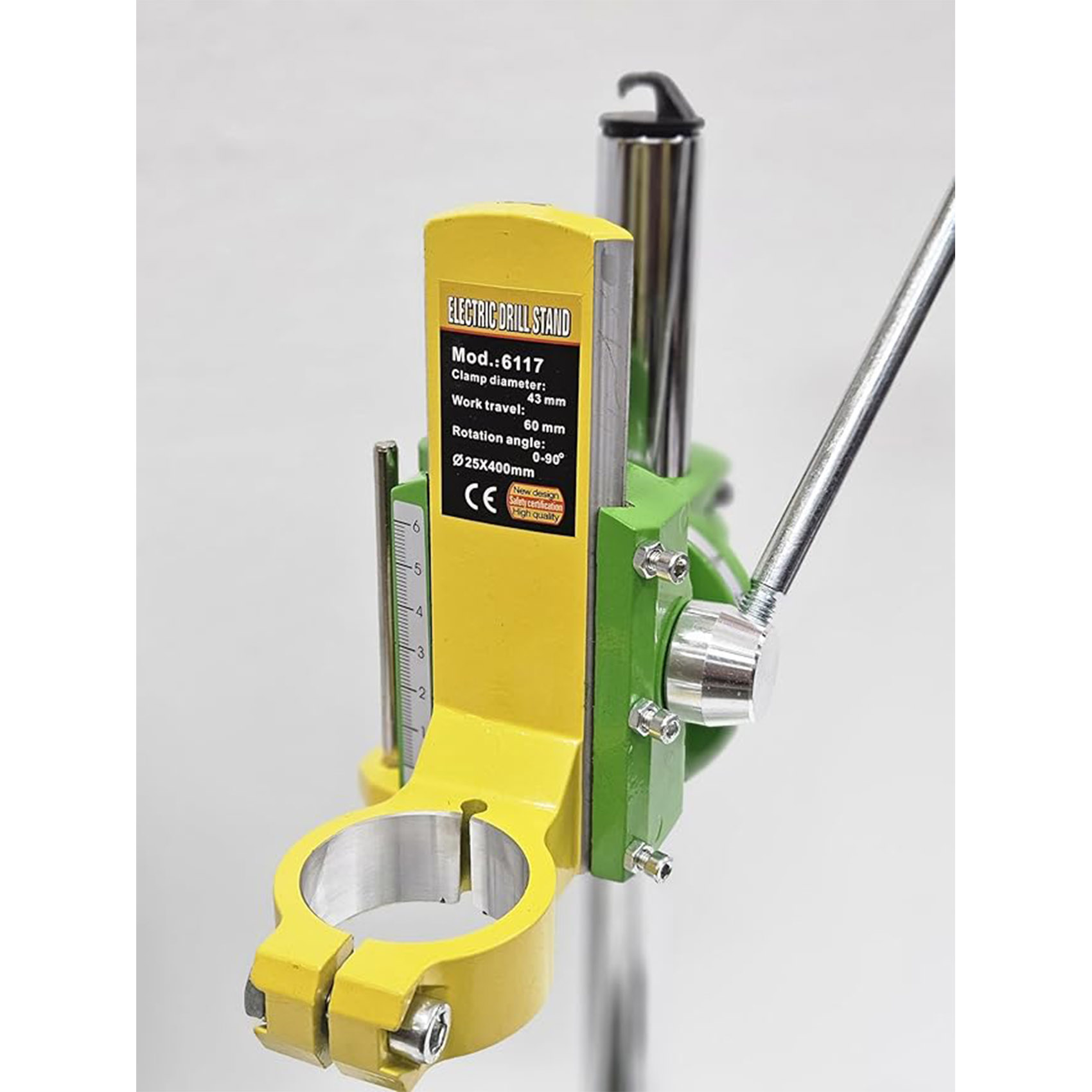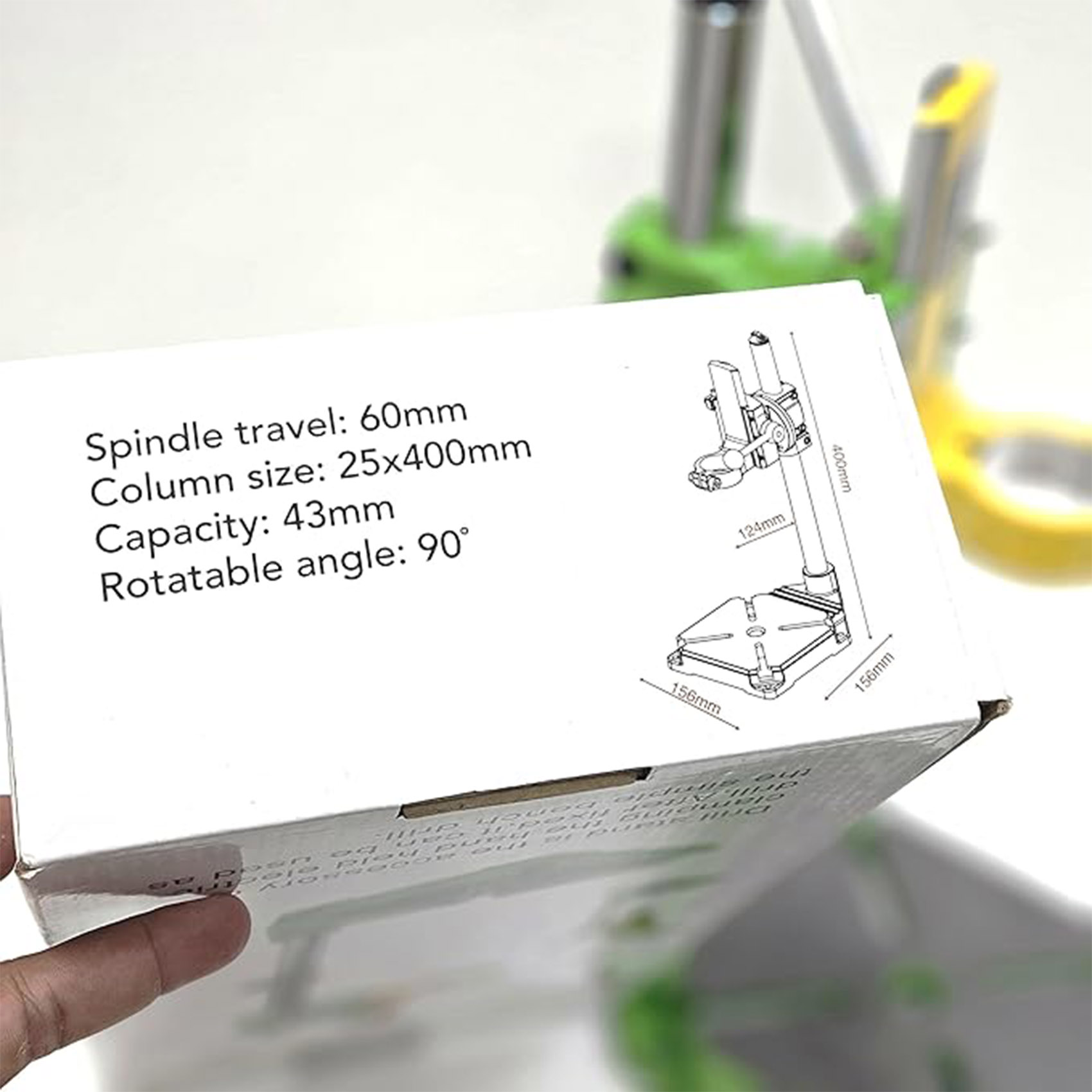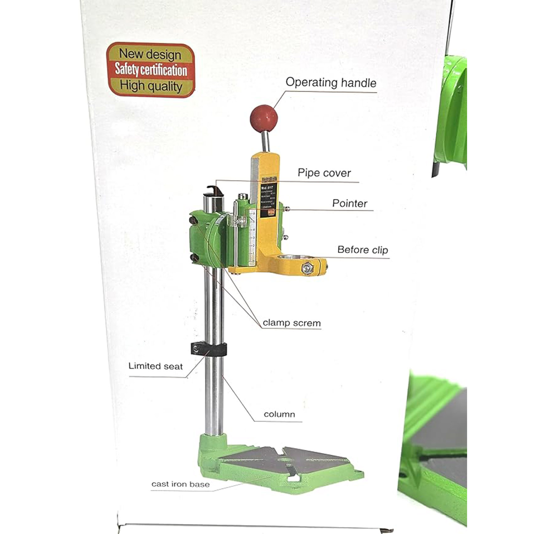 TRANSFORM YOUR HANDHELD ELECTRIC DRILL INTO A PRECISION WORKSTATION WITH THIS VERSATILE DRILL STAND. FEATURING A ROBUST CAST IRON BASE FOR STABILITY AND A 43MM CLAMP CAPACITY, THIS STAND ACCOMMODATES MOST STANDARD DRILLS. THE ADJUSTABLE COLUMN HEIGHT OF 400MM AND 60MM SPINDLE TRAVEL PROVIDE AMPLE WORKING SPACE FOR VARIOUS PROJECTS. THE INNOVATIVE 90-DEGREE ROTATABLE ANGLE ALLOWS FOR BOTH VERTICAL AND HORIZONTAL DRILLING OPERATIONS, WHILE THE PRECISE DEPTH GAUGE ENSURES ACCURATE, CONSISTENT RESULTS. THE ERGONOMIC OPERATING HANDLE OFFERS SMOOTH CONTROL, AND THE STURDY CONSTRUCTION INCLUDES A POINTER FOR ENHANCED ACCURACY. THE STAND'S THOUGHTFUL DESIGN INCORPORATES A LIMITED SEAT AND COLUMN SYSTEM FOR SECURE POSITIONING, WHILE THE INCLUDED CLAMP SCREWS AND ADAPTORS ENSURE YOUR DRILL REMAINS FIRMLY IN PLACE DURING OPERATION. PERFECT FOR DIY ENTHUSIASTS AND WORKSHOPS, THIS DRILL STAND BRINGS PROFESSIONAL-LEVEL PRECISION TO YOUR DRILLING TASKS.