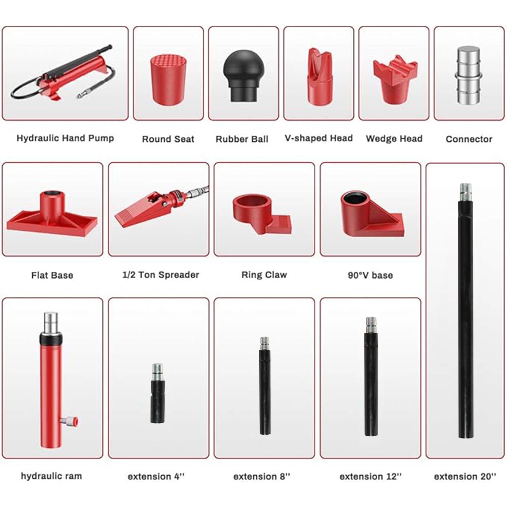 INCLUDES : PUMP, RAM, EXTENSION TUBES, MALE CONNECTOR, HYDRAULIC SPREADER, WEDGE HEAD, RUBBER HEAD, SERRATED SADDLE, V-BASE, RAM TOE, PLUNGER TOE, FLAT BASE, HYDRAULIC HOSE