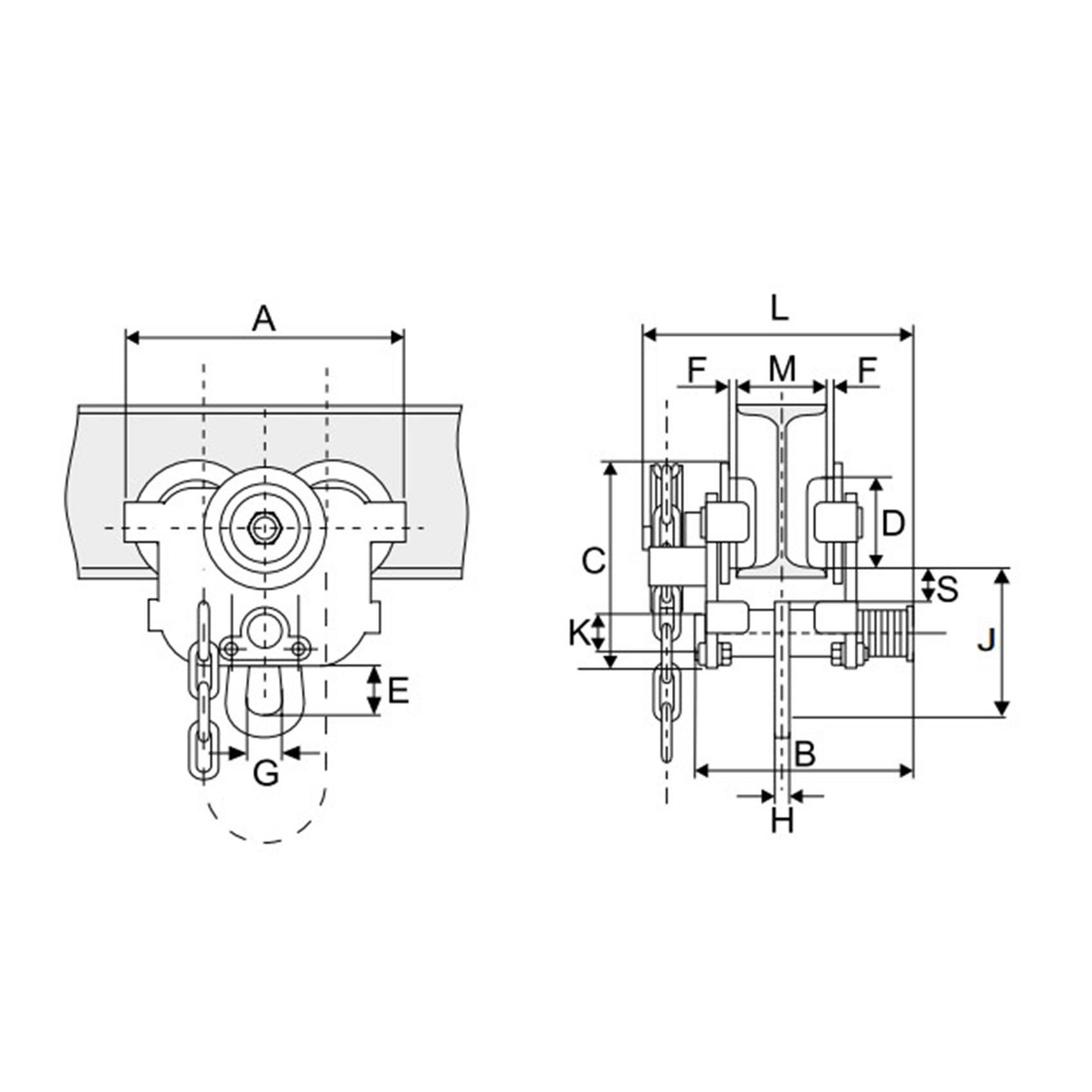 . WHEELS OF THE TROLLEY FIT BOTH I-BEAMS AND H-BEAMS.
