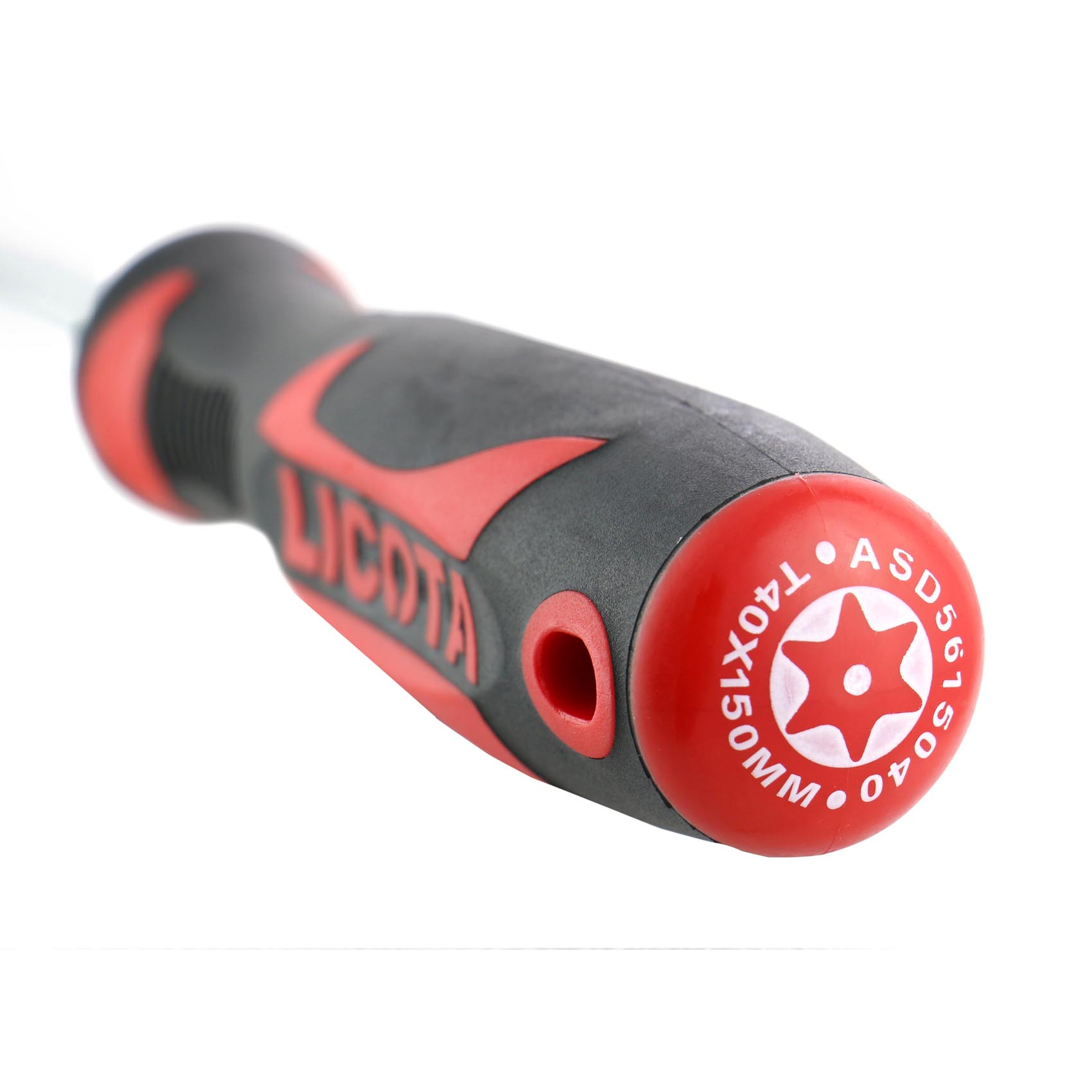 The LICOTA Torx Screwdriver 40x150mm (ASD-5615040) is a professional-grade tool made in Taiwan. It features a T40H size with a blade hardened to H.R.C. 58-62, satin finished, and a black magnetic tip for improved grip. Made from high-quality S2 material, it has dimensions of 150mm in length, 129mm in total length, and a 8mm diameter. The screwdriver weighs 205g and adheres to the DIN 50150 standard, making it an excellent choice for heavy-duty tasks.