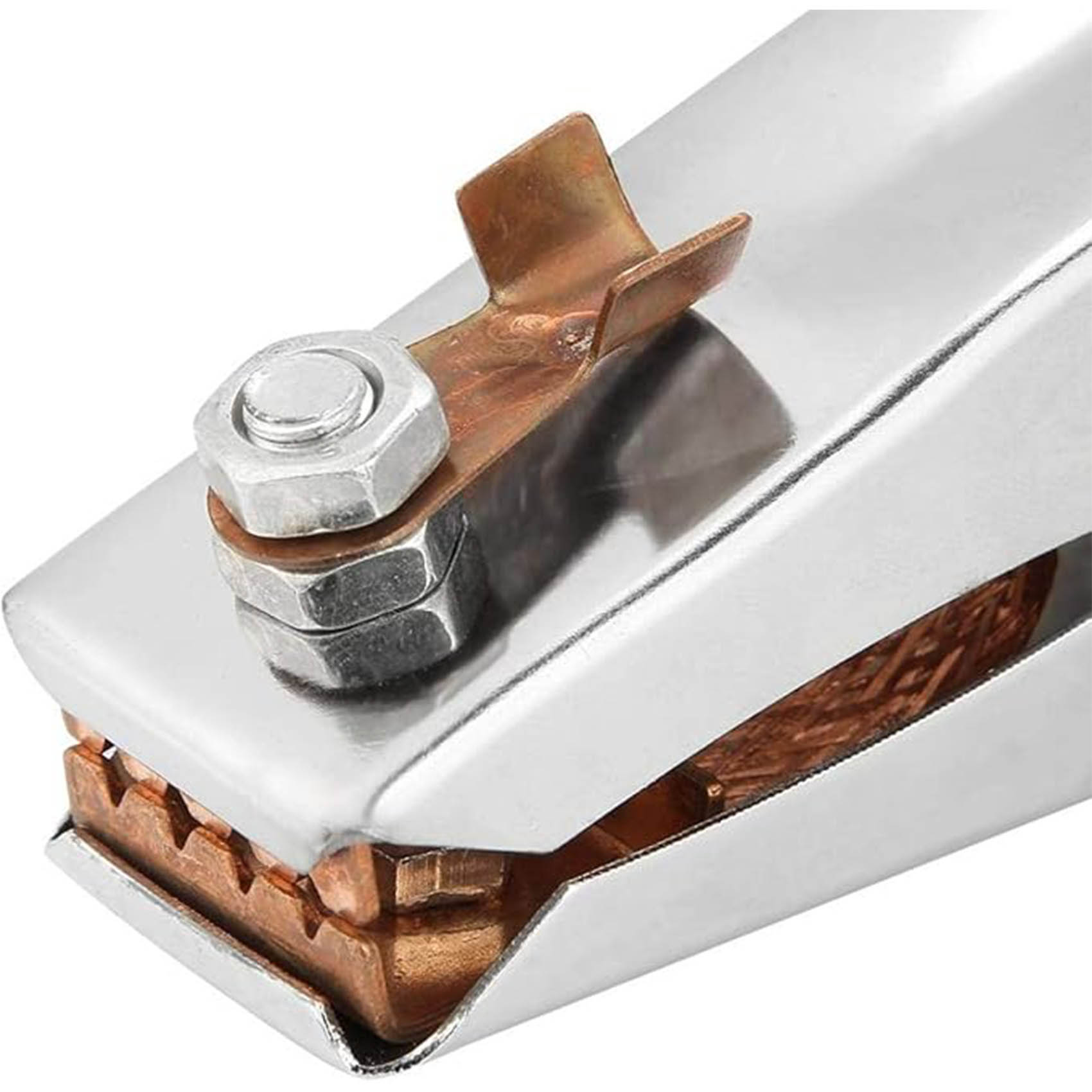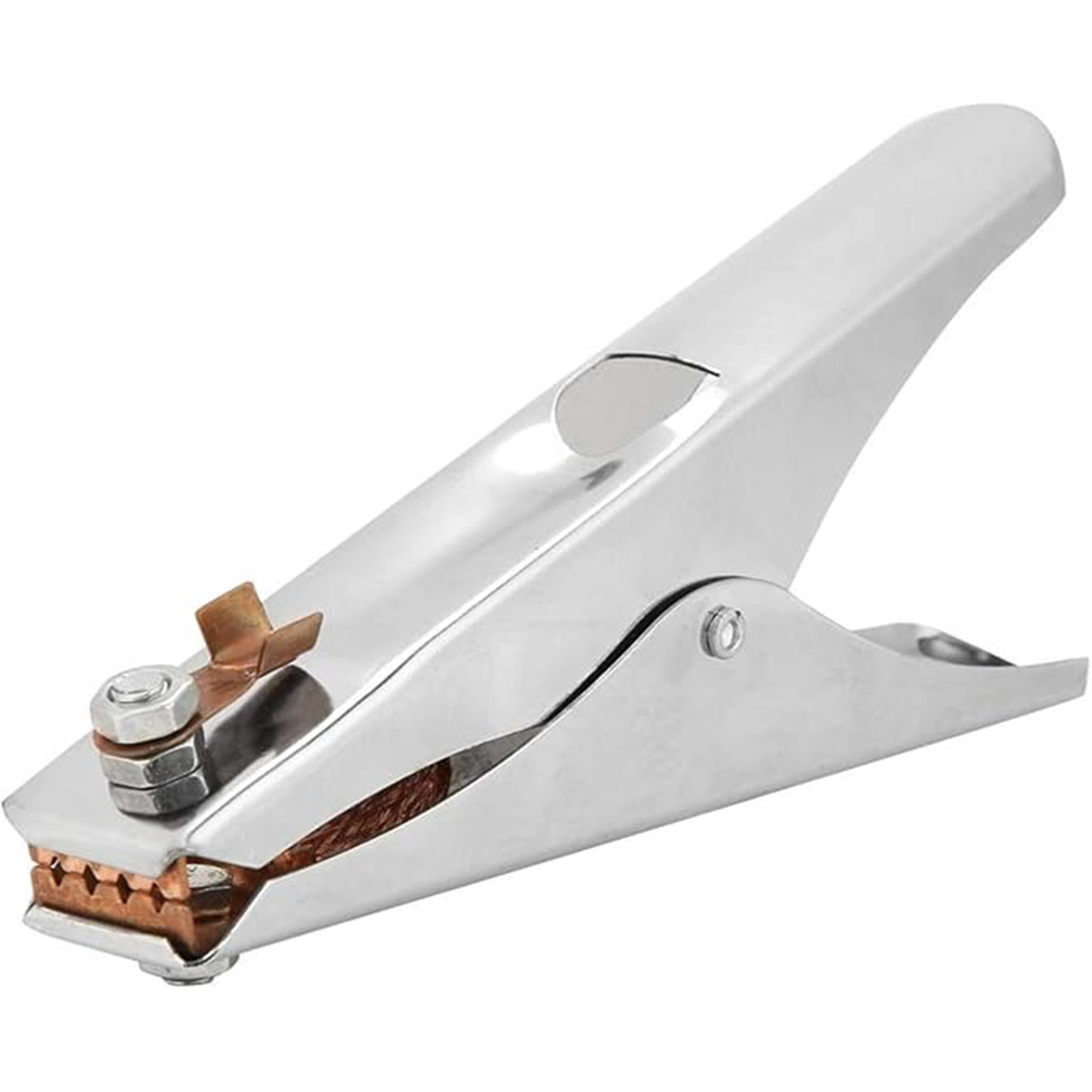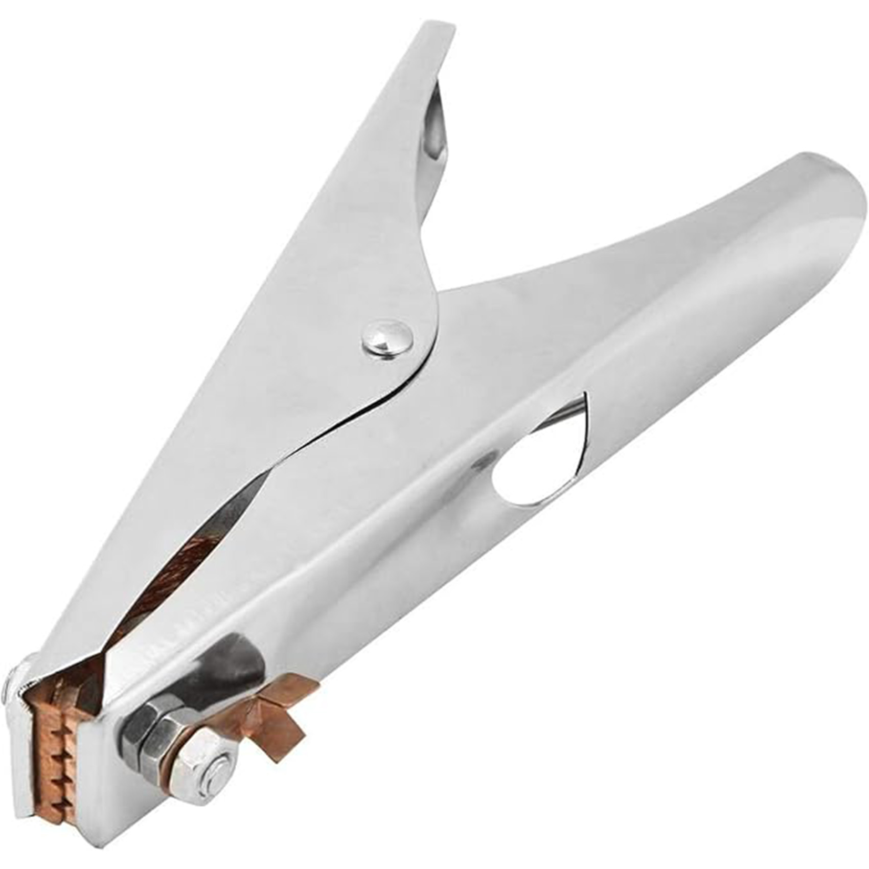 . SPRING-LOADED CROCODILE/CLIP STYLE CLAMP WITH COPPER CONTACT PARTS AT THE JAW AND A HEAVY BOLT CONNECTION FOR THE WELDING CABLE.