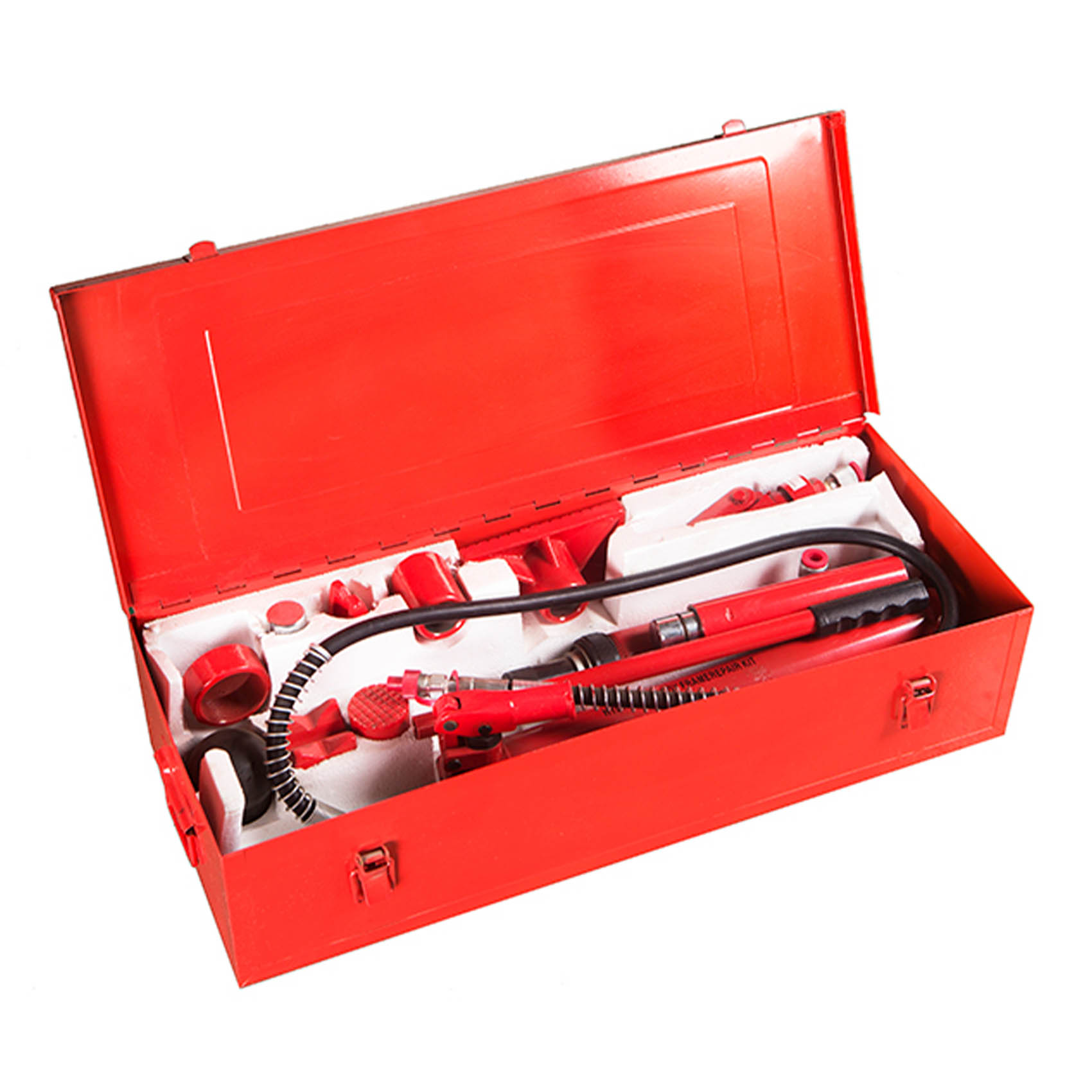 INCLUDES : PUMP, RAM, EXTENSION TUBES, MALE CONNECTOR, HYDRAULIC SPREADER, WEDGE HEAD, RUBBER HEAD, SERRATED SADDLE, V-BASE, RAM TOE, PLUNGER TOE, FLAT BASE, HYDRAULIC HOSE