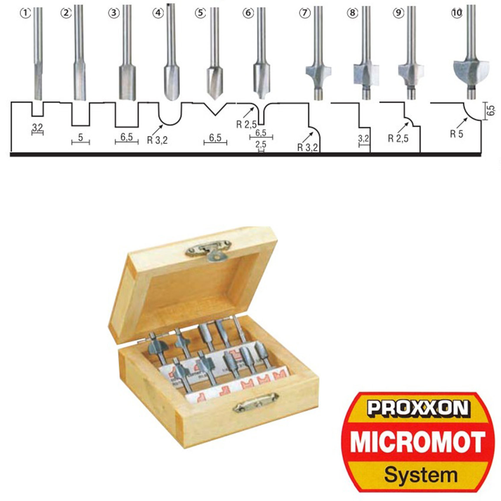 DIMENSION : SLOT CUTTER Ø 3.2 TO 4.8 AND 6.5 MM, ROUNDING OVER CUTTER Ø 6.4 MM, V-SLOT CUTTER Ø 6.5 MM, COMBI CUTTER 6.5/2.5 MM, CORE BOX BIT R 3.2 MM, REBATING CUTTER 6.4 MM, EDGE CUTTER WITH PIN 5, ANGLE CUTTER 45°.
