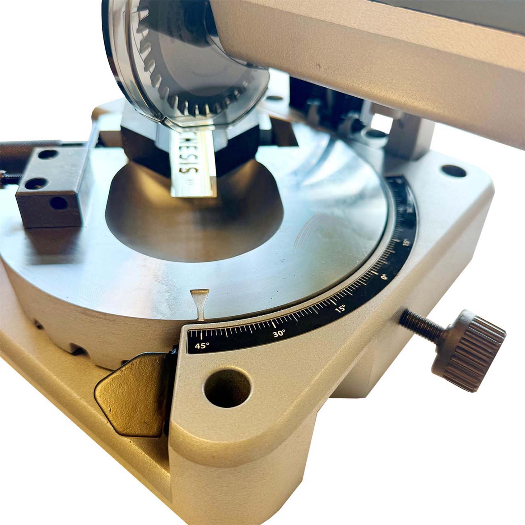. IDEAL FOR MITRE CUTS: ADJUSTMENTS ARE MADE TO THE ROUND TABLE WITH CLAMPED WORK PIECE AND NOT TO THE HEADSTOCK.