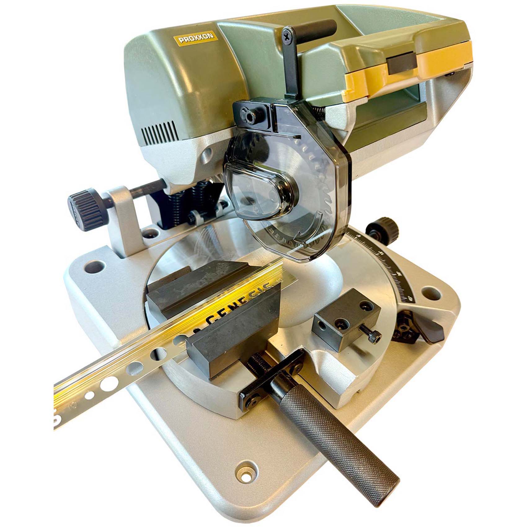 MATERIAL : BASE WITH ROUND TABLE OF HIGHLY STABLE DIE-CAST ALUMINIUM WITH CNC-MILLED FITTINGS AND SLIDES. TUNGSTEN-TIPPED SAW BLADE FOR NON-FERROUS METAL, WOOD AND PLASTICS (80 X 1.6 X 10MM, 36 TPI).