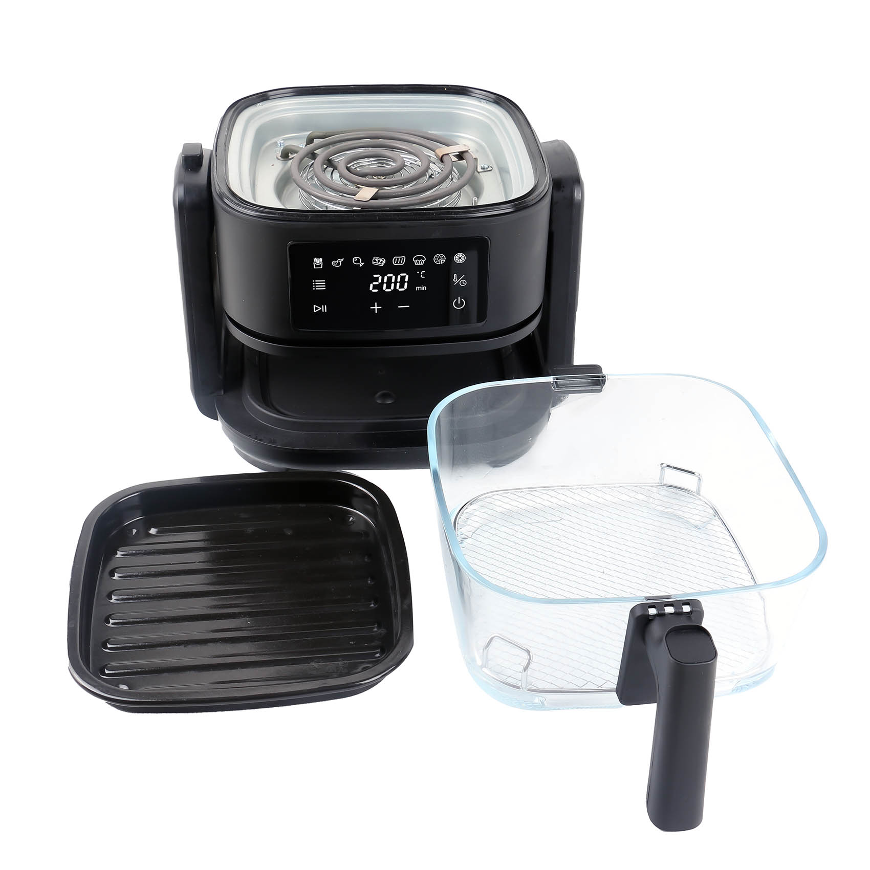 INCLUDES : REMOVEABLE WIRE GRILL - REMOVEABLE NON-STICK COATING GRILL TRAY - REMOVEABLE GLASS BUCKET - NON-STICK TEFLON COATING