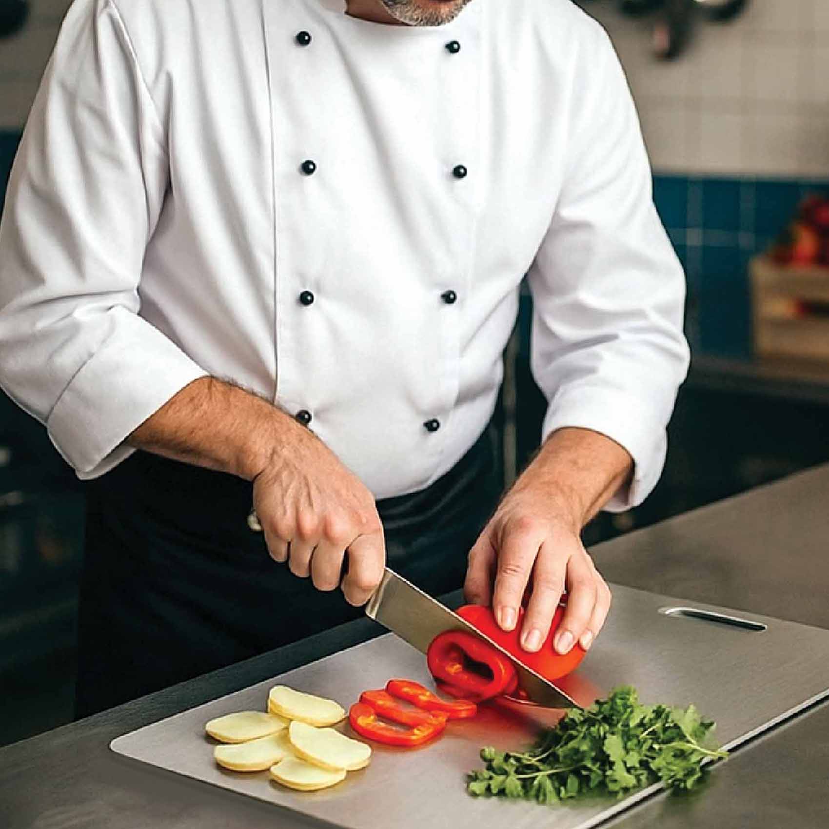 NAMSON STAINLESS STEEL CUTTING BOARD IS INCREDIBLY DURABLE. THEY ARE VERY RESISTANT TO WEAR AND TEAR THAT MOST OTHER CUTTING BOARDS CAN'T WITHSTAND. EVEN AFTER HEAVY USE, YOU'LL NOTICE THAT STEEL CUTTING BOARDS ARE RESISTANT TO SCRATCHES AND KNIFE.