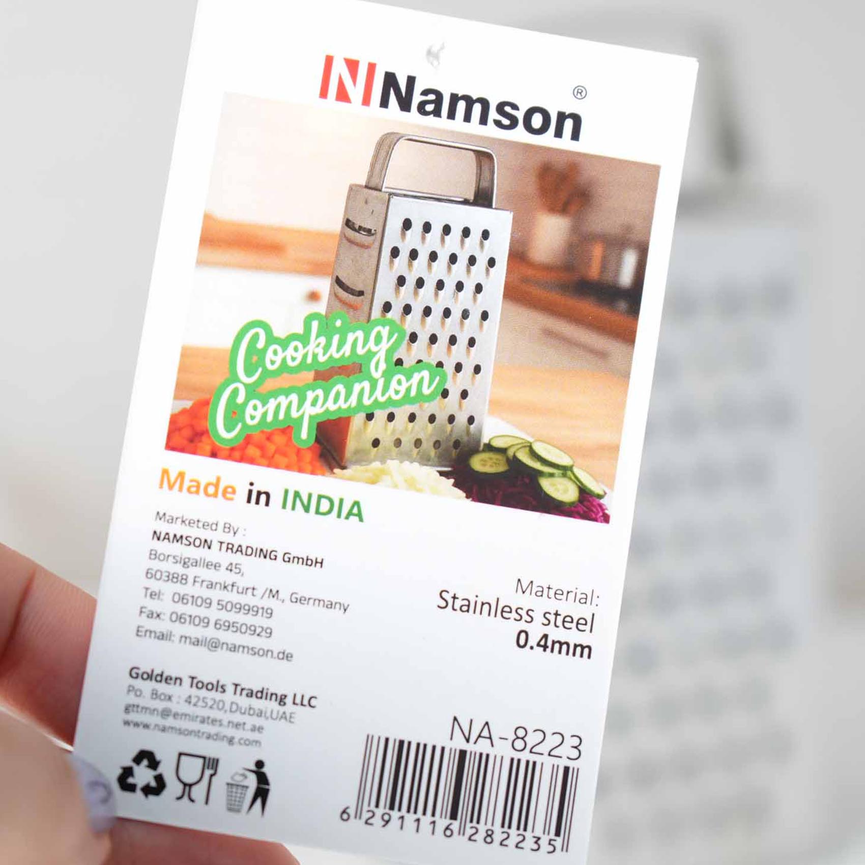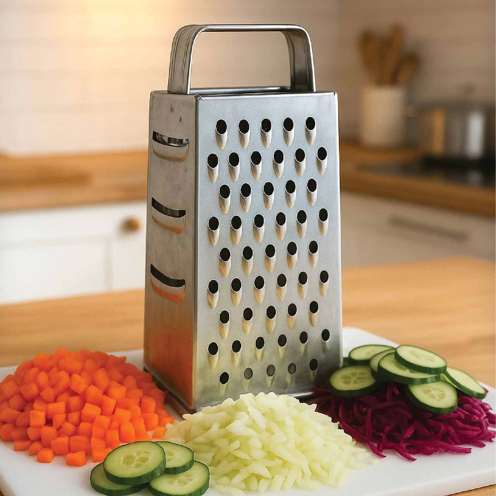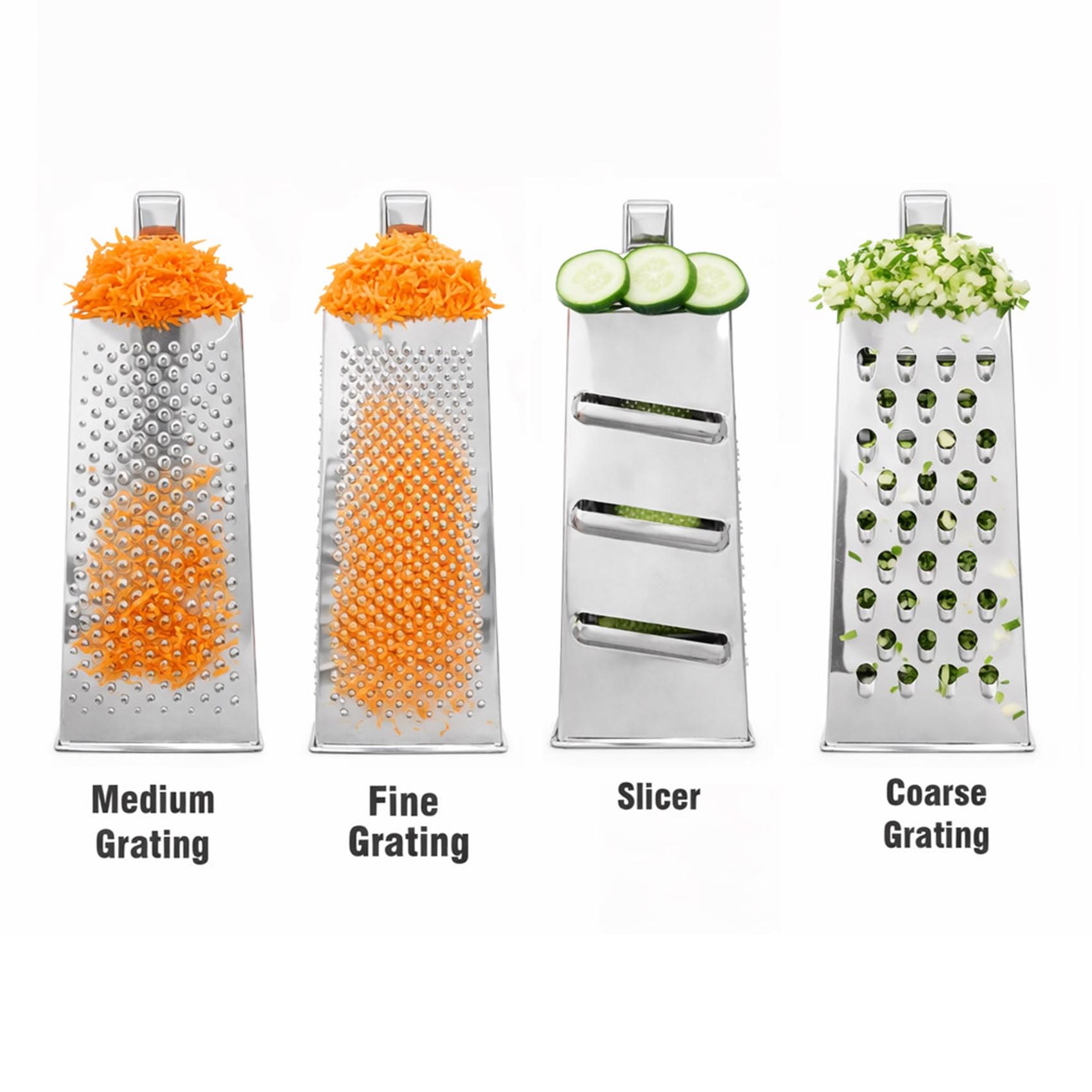 NAMSON 4 SIDE GRATER IS MADE OF STAINLESS STEEL WITH MULTIPLE FUNCTIONS INCLUDES COARSE, MEDIUM, FINE, MICROGRATING/ZESTING/SLICING SURFACE.THE GRATER FEATURES 4 FUNCTIONAL GRATING SURFACES WITHOUT TAKING UP A LOT OF SPACE IN YOUR DRAWER. THE WIDE STAINLESS STEEL COURSE AND MEDIUM BLADES ARE IDEAL FOR CHEESE AND VEGETABLES, A SLIMMER FINE GRATING SURFACE IS IDEAL FOR NUTMEG, GINGER, AND CITRUS FRUITS, WHILE THE SLICING SURFACE YIELDS PERFECT SLICES OF CHEESE, CUCUMBER, COURGETTE AND MORE.THE SOFT, COMFORTABLE NONSLIP HANDLE ENSURES YOU HAVE A FIRM GRIP, EVEN IF YOUR HANDS ARE WET, AND CUSHIONS YOUR HANDS DURING REPETITIVE GRATING. THE NONSLIP BASE KEEPS THE GRATER STEADY ON A PLATE OR CHOPPING BOARD. WHEN NOT IN USE, IT FITS NEATLY IN A DRAWER MAKING IT EASY FOR STORAGE.