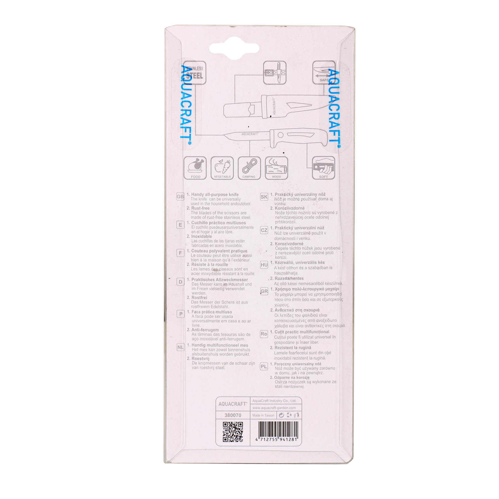 The AQUACRAFT Universal Stainless Steel Utility Knife 380070 is a versatile cutting tool designed for a wide range of everyday tasks in the household, garden, agriculture, irrigation work, and outdoor activities. Its sharp stainless steel blade allows efficient cutting of vegetables, small wood pieces, ropes, packaging materials, and other general-purpose materials.