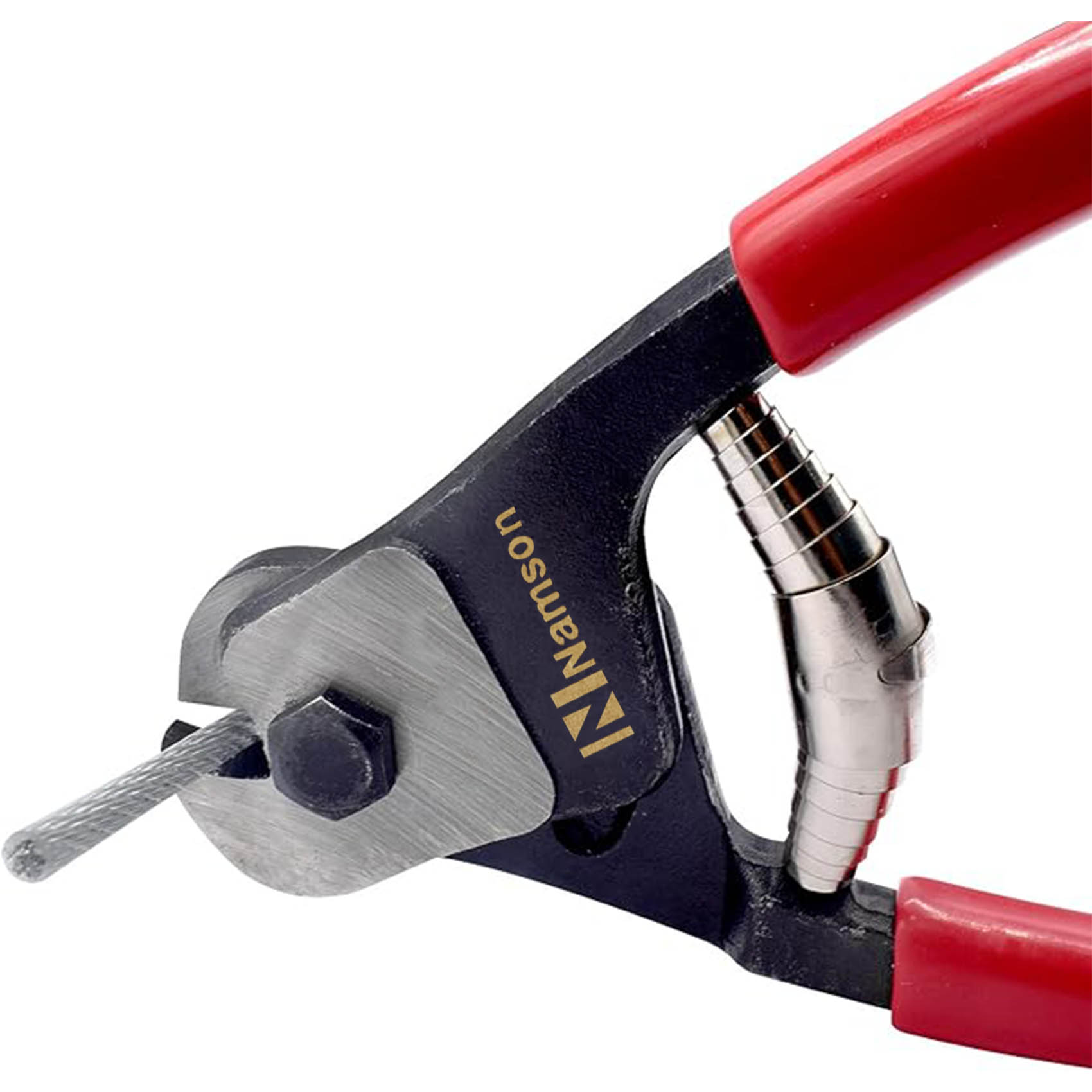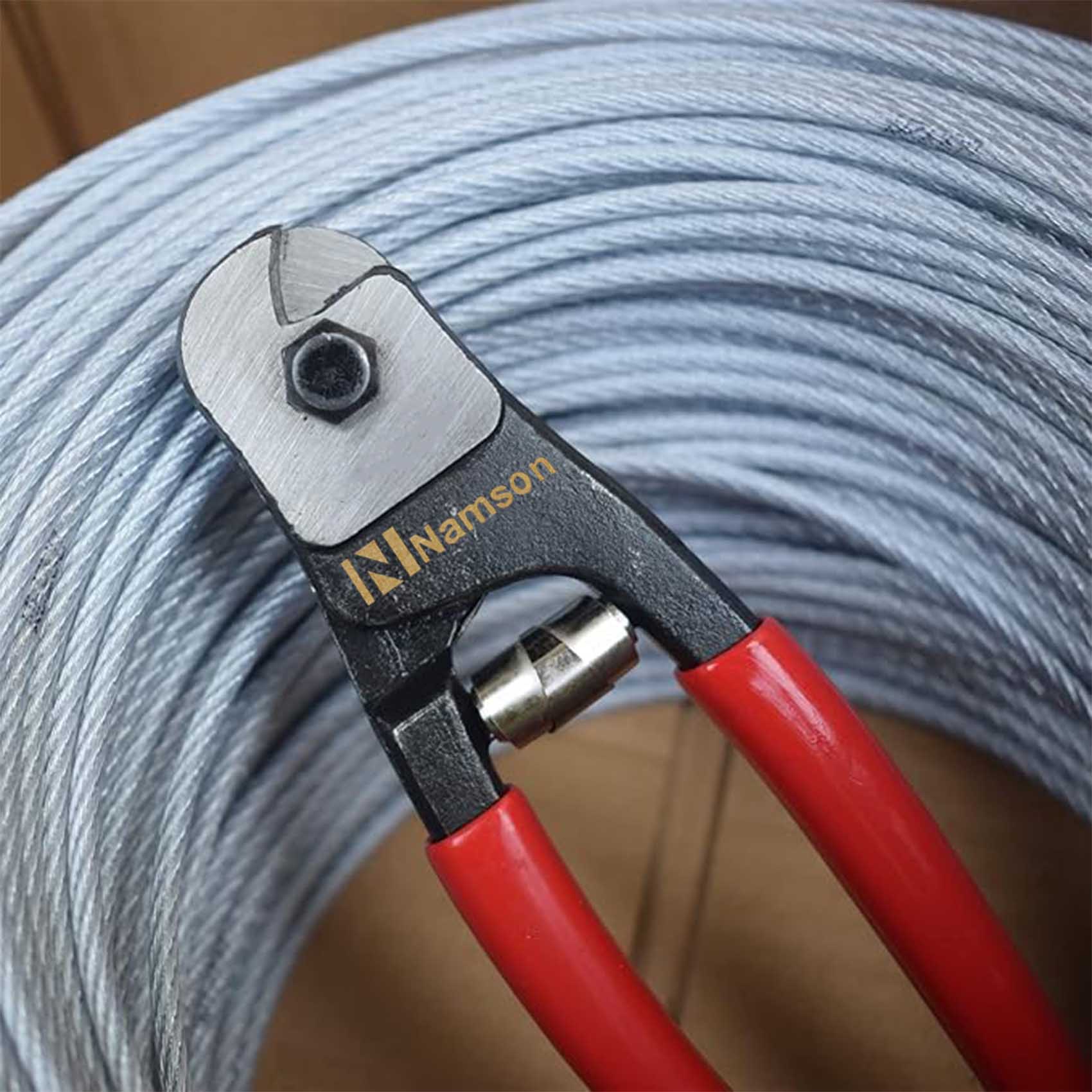 NAMSON 8" WIRE ROPE CUTTER FEATURES SHEAR-CUT BLADES THAT PROVIDE A CLEAN, PRECISE CUT WITHOUT CRUSHING OR FRAYING THE CABLE STRANDS. SUITABLE FOR A MULTITUDE OF AGRICULTURAL, GARDEN, AUTOMOTIVE AND MARINE CUTTING TASKS. ABLE TO CUT THROUGH A VARIETY OF DIFFERENT METAL WIRE OR ROPE MATERIALS DUE TO ANGLED HARDENED JAWS.