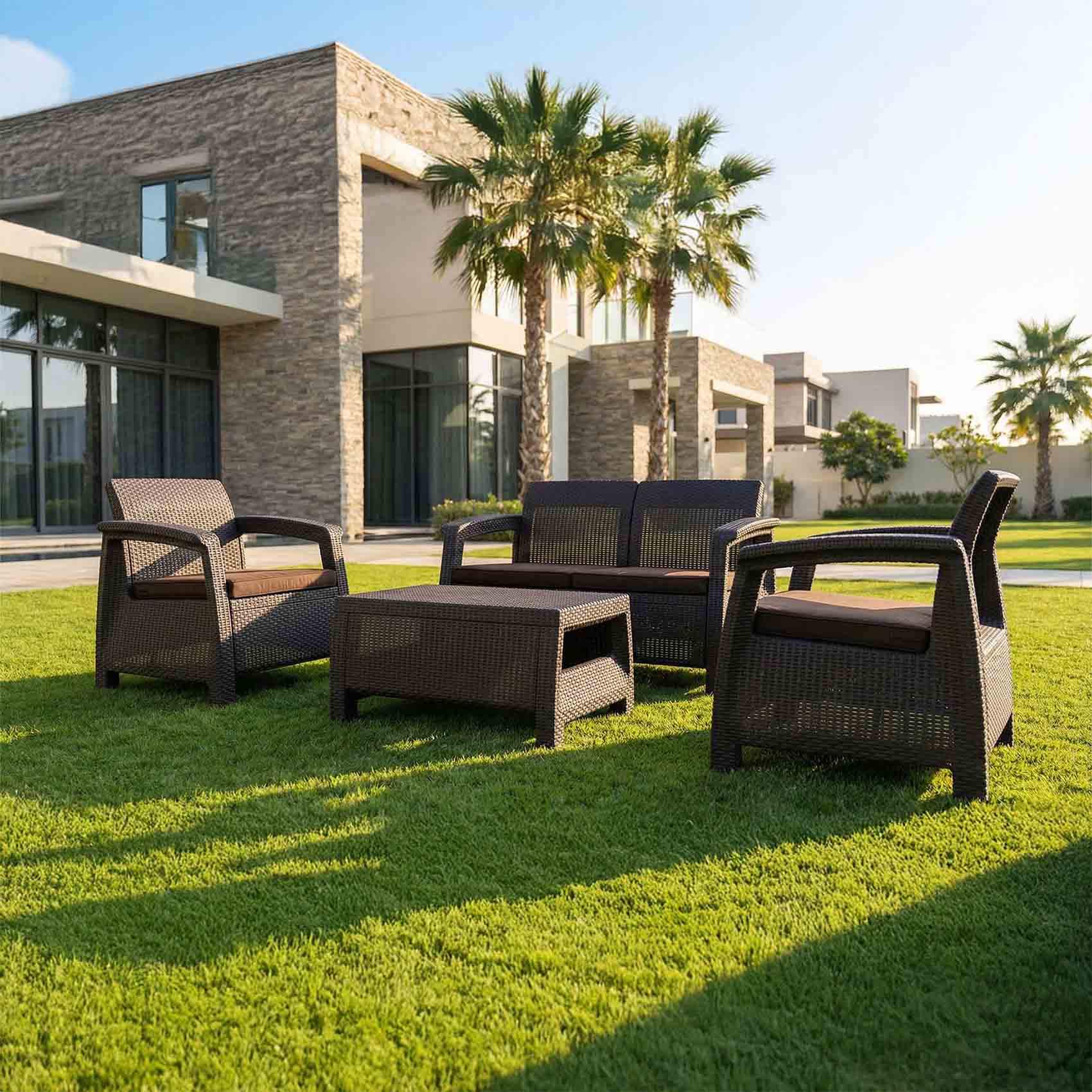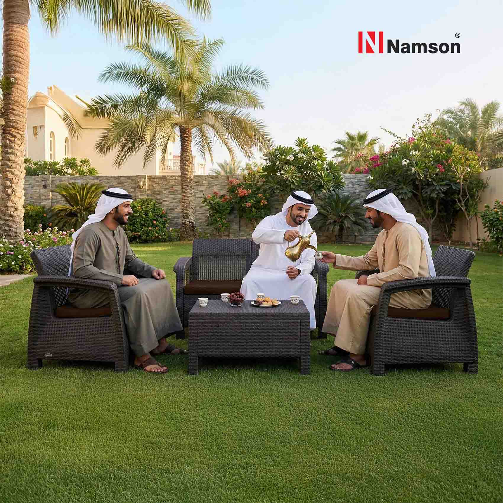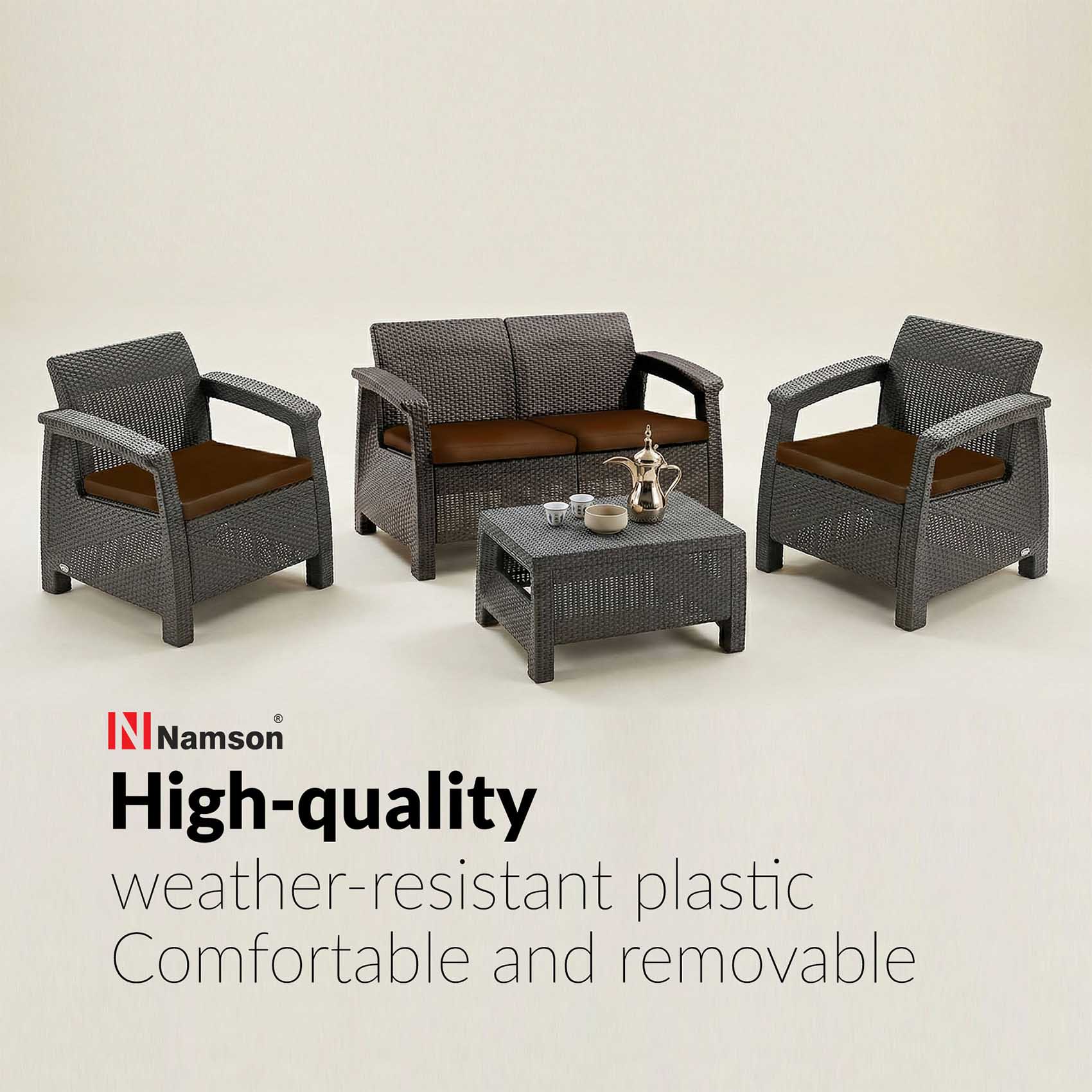 GIVE YOUR OUTDOOR SEATING AREA AN UPGRADE WITH FURNITURE THAT'S DESIGNED TO LOOK GOOD AND FEEL EVEN BETTER. THE NAMSON 4 SEATER LOUNGE SET, IS ERGONOMICALLY DESIGNED, MAKING IT EASY FOR YOU TO LOUNGE AS LONG AS YOU LIKE. SIMPLE BUT ELEGANT, THE RANGE IS MADE WITHOUT METALLIC FRAMES SO THEY DO NOT RUST, AND THEREFORE REQUIRES LITTLE MAINTENANCE GIVING YOU THE OPTIMAL FINISH THAT LOOKS CONSISTENTLY GOOD ALL YEAR ROUND.
