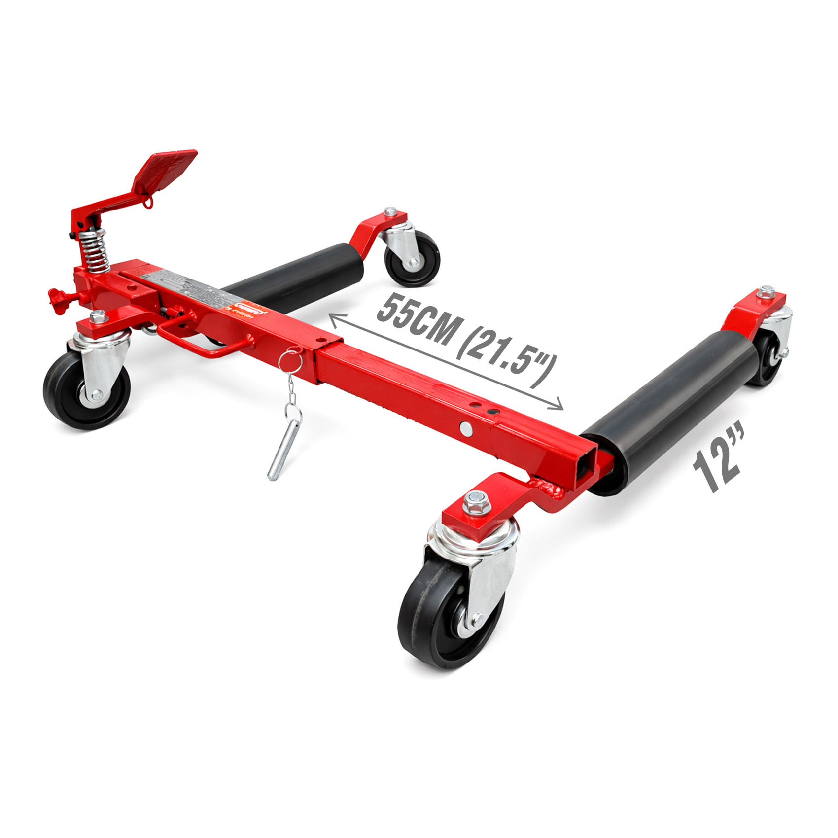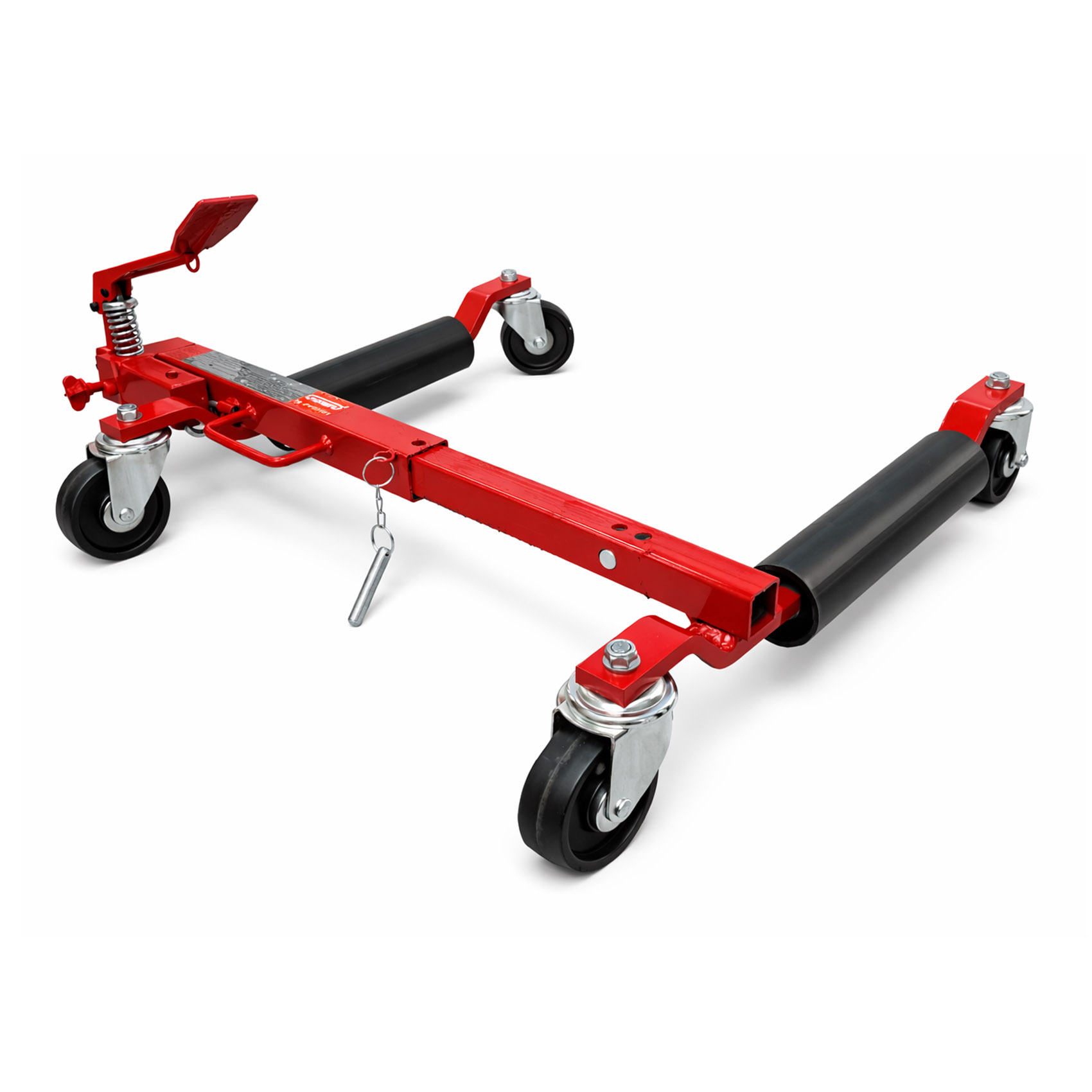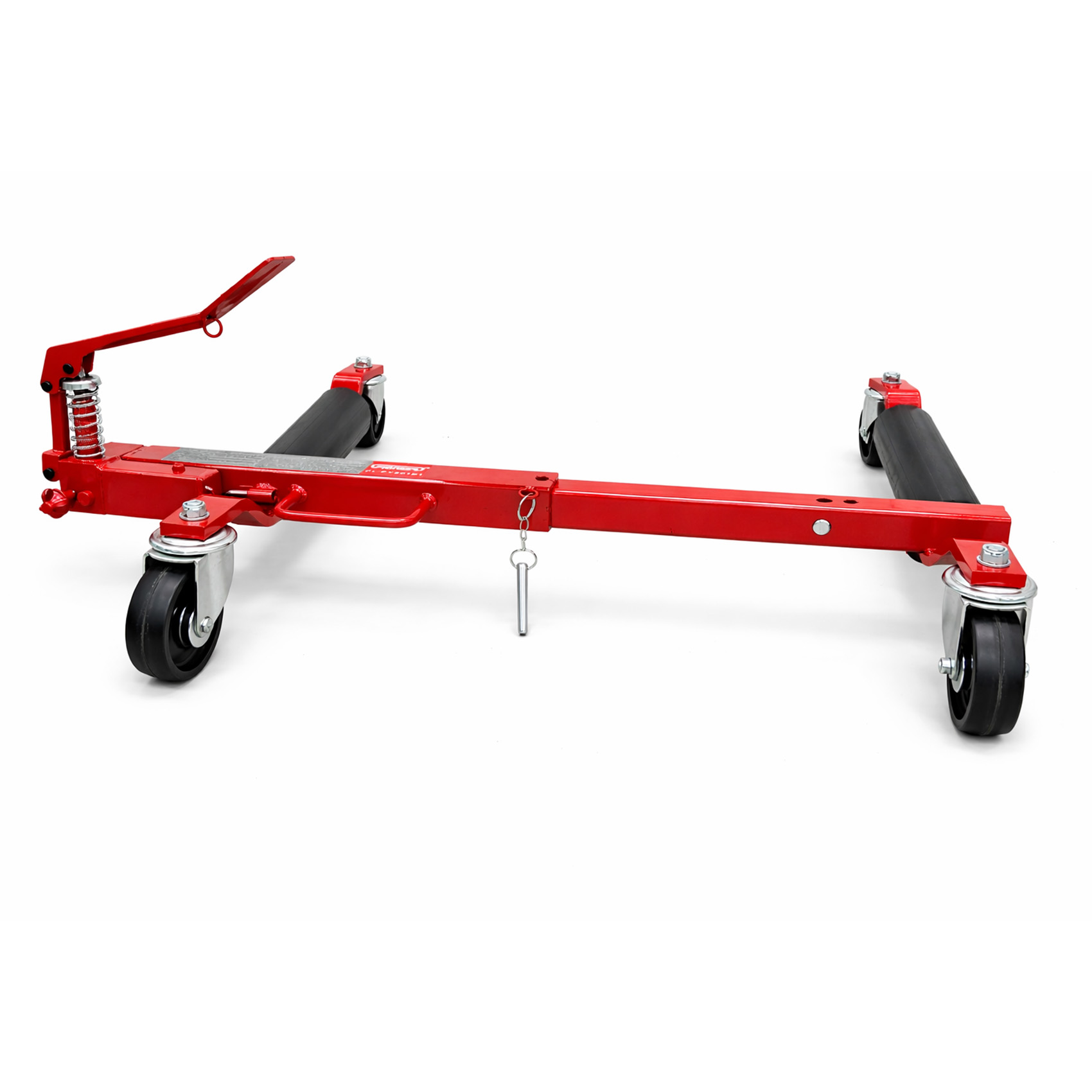Position the wheel dolly around the tire on a flat surface, ensure the vehicle is in neutral with the parking brake released (if safe to do so), then pump the pedal or operate the handle to clamp and lift the wheel slightly off the ground; once all required wheels are supported, carefully push the vehicle to move it into the desired position, and finally release the mechanism slowly to lower the tire back onto the ground and remove the dolly.