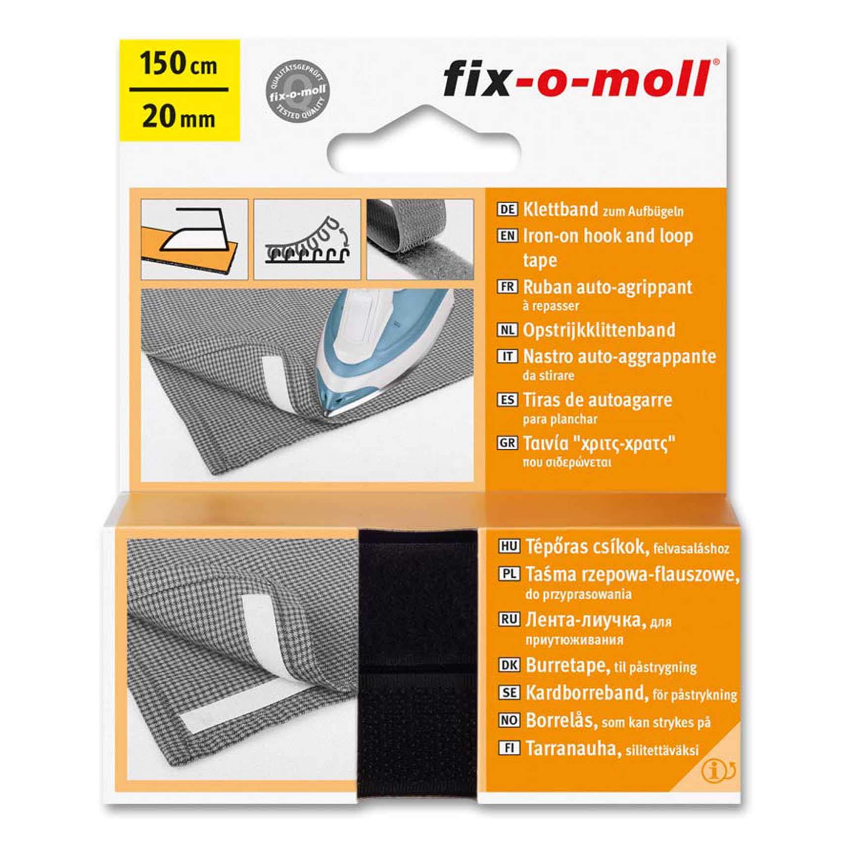 The Velcro is to be ironed on at 110C for 30 seconds and is washable up to 30C 150CM20MM