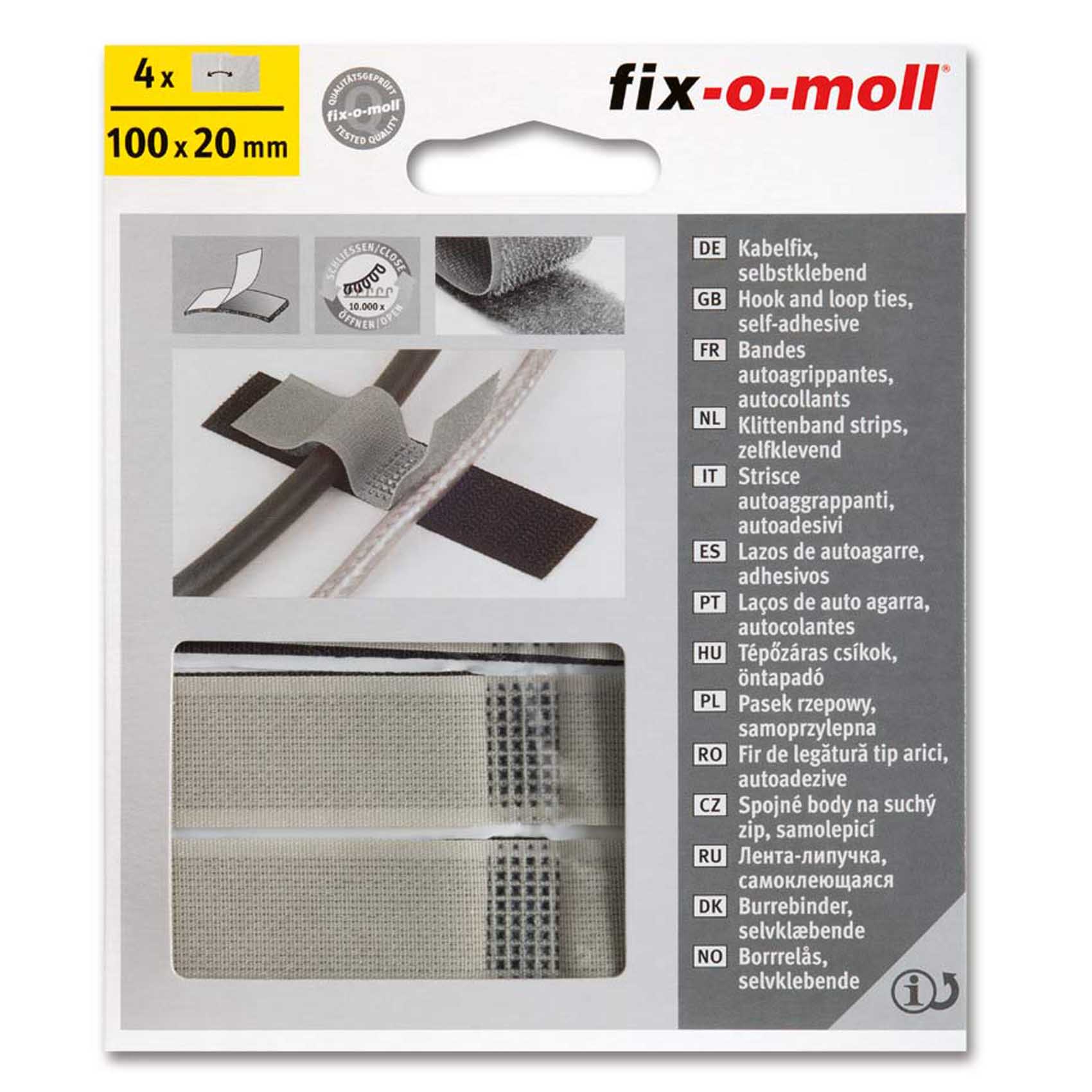 Fix-o-moll cable fastening can be stuck with Velcro The cable fastening is self-adhesive 4 pcs in the package Length of attachment 1 m width 20 mm Fix-o-moll cable attachment can be stuck with velcro Q