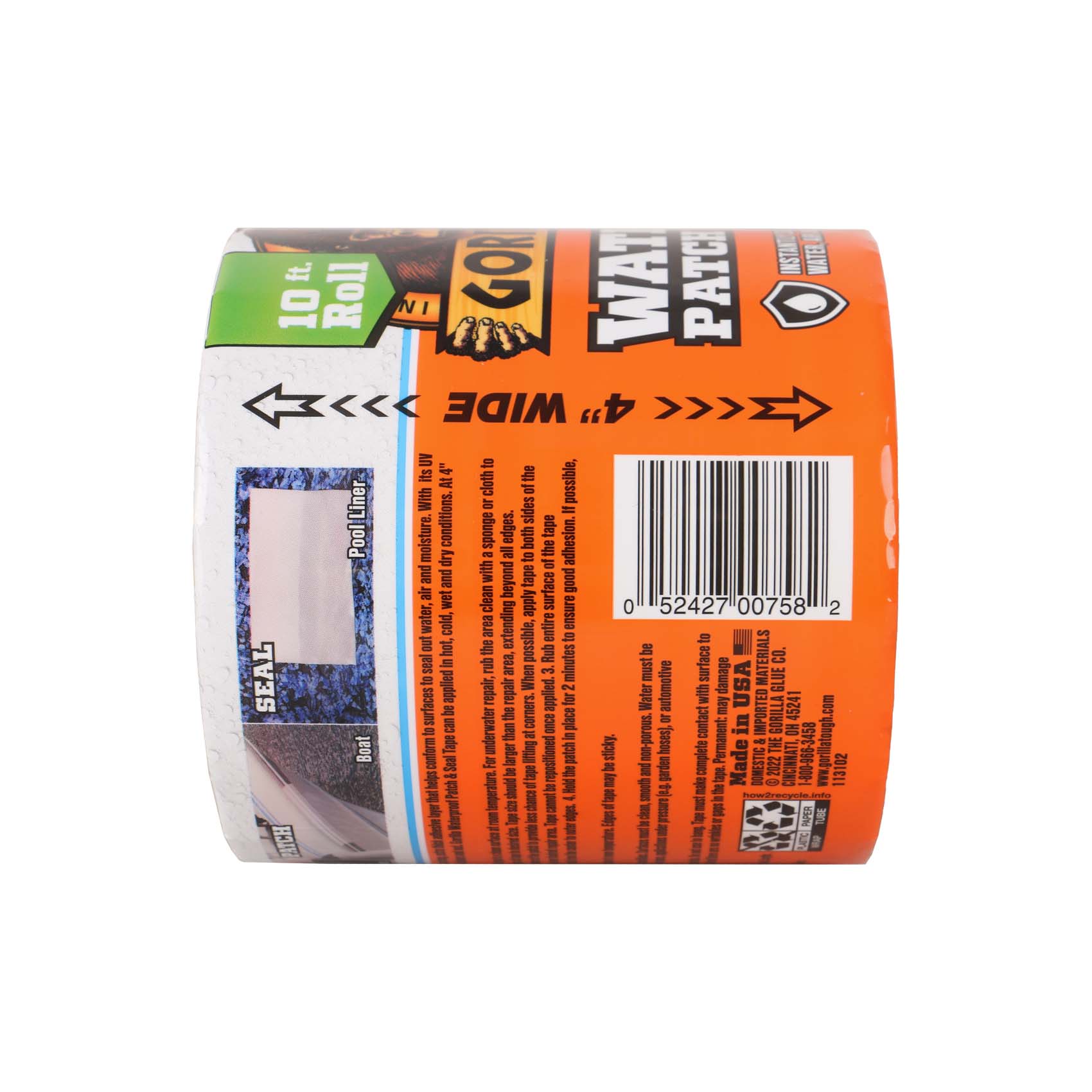 GORILLA WATERPROOF PATCH & SEAL TAPE INSTANTLY SEALS OUT WATER, AIR AND MOISTURE. WITH AN EXTRA THICK ADHESIVE LAYER AND UV RESISTANT BACKING THIS TAPE CONFORMS TO FORM A PERMANENT BOND INDOORS AND OUT. AT 4" WIDE USE IT TO PATCH HOLES, CRACKS, GAPS AND TEARS, EVEN UNDERWATER. EXCELLENT FOR HOME, AUTO, MARINE, CAMPING, RVS, OUTDOORS AND MORE!