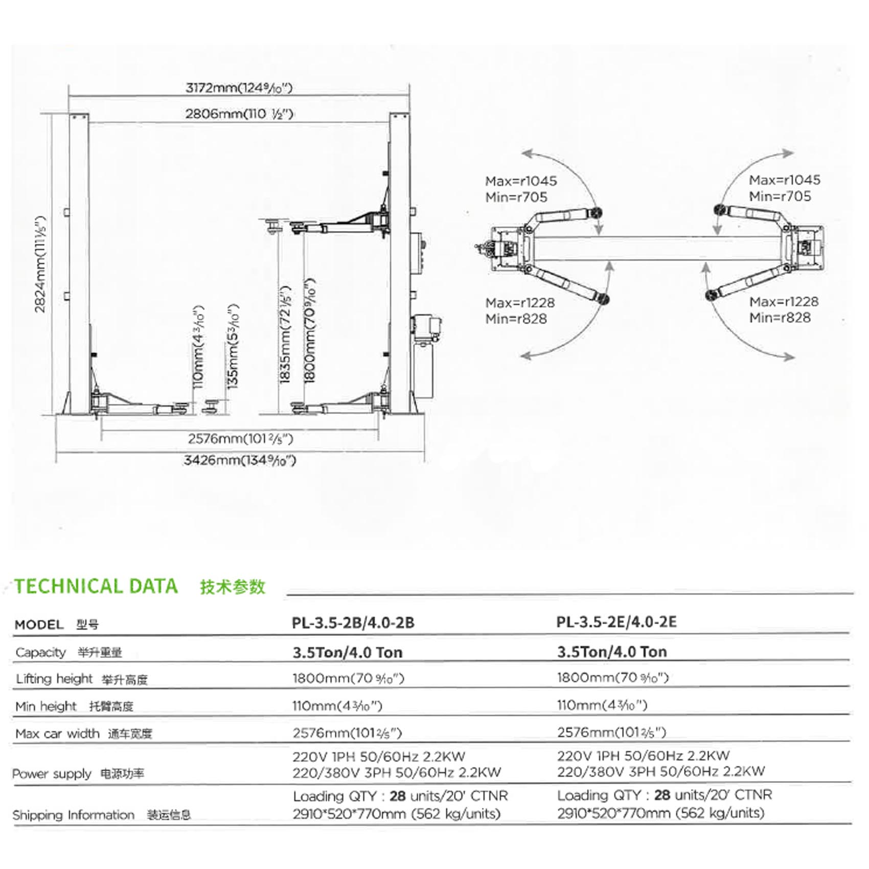 THE PIONEER PPL-4.0-2B3P HYDRAULIC 2-POST LIFT IS A HEAVY-DUTY CLEAR-FLOOR VEHICLE LIFT DESIGNED FOR GARAGES, CAR WASHES, AND SERVICE CENTERS. WITH A 4-TON LIFTING CAPACITY AND A LIFTING HEIGHT OF 1930MM, IT EFFICIENTLY HANDLES VARIOUS VEHICLE SIZES. THE ELECTRIC LOCK RELEASE SYSTEM ENSURES SMOOTH AND SECURE OPERATION, WHILE THE DOUBLE-CYLINDER PLANER-TYPE LIFT MECHANISM PROVIDES STABILITY AND STRENGTH. POWERED BY A 2.2KW MOTOR, IT OPERATES ON 220V SINGLE-PHASE OR 380V THREE-PHASE POWER (50/60HZ) FOR VERSATILE INSTALLATION OPTIONS. THE MINIMUM HEIGHT OF 90MM ALLOWS FOR LOW-CLEARANCE VEHICLES, AND IT ACCOMMODATES CARS UP TO 22610MM IN WIDTH. WITH ITS ROBUST CONSTRUCTION AND PROFESSIONAL-GRADE PERFORMANCE, THIS BLUE HYDRAULIC LIFT IS AN ESSENTIAL TOOL FOR AUTOMOTIVE MAINTENANCE AND REPAIR.